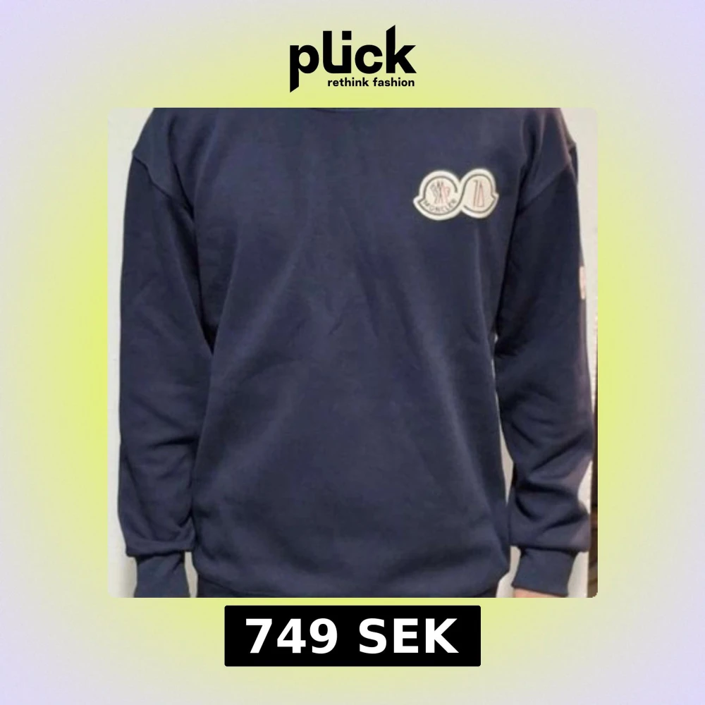 Säljer en stilren mörkblå sweatshirt från Moncler med deras ikoniska logga på bröstet och ärmen. Tröjan har långa ärmar och en klassisk rund halsringning. Perfekt för en avslappnad och trendig look.