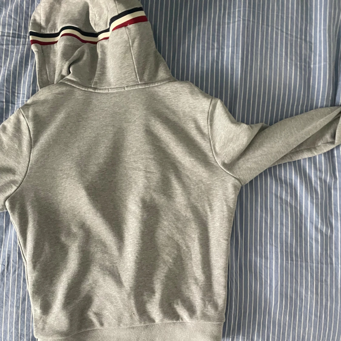 Snygg grå hoodie från Moncler med hel dragkedja, huva med röd, vit och marinblå rand samt broderad logga på ärmen. Tröjan har kängurufickor och är tillverkad i mjuk bomullsmix. Perfekt för chill dagar eller när du vill ha en clean look.