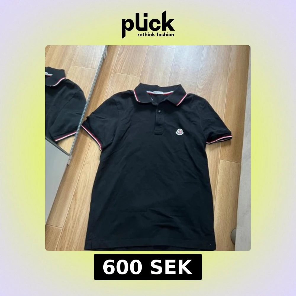 Svart pikétröja från Moncler med klassisk krage och knäppning framtill. Tröjan har röda och vita ränder på krage och ärmslut samt Moncler-logga på bröstet. Tillverkad i bomull och har korta ärmar. Perfekt för en clean och stilren look.