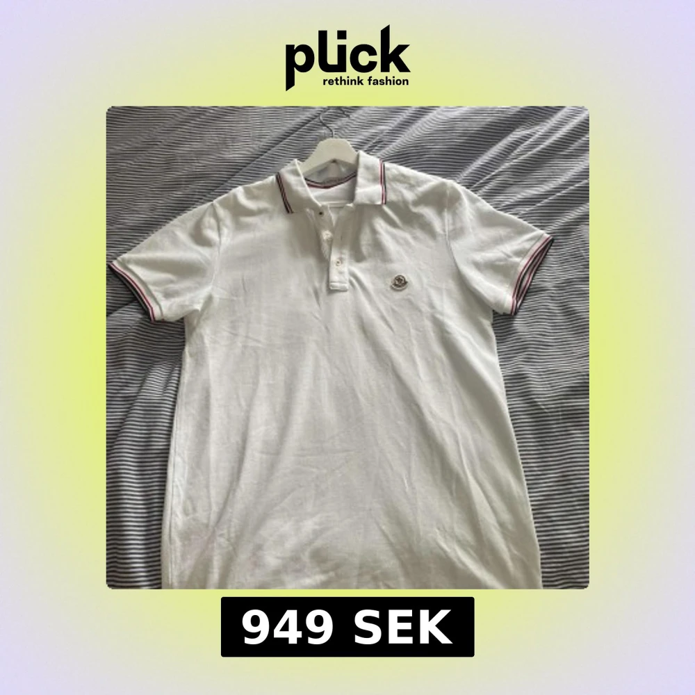 Vit pikétröja från Moncler med klassisk krage och knäppning framtill. Tröjan har röda och marinblå ränder på krage och ärmslut samt Moncler-logga broderad på bröstet. Tillverkad i bomull och har korta ärmar.