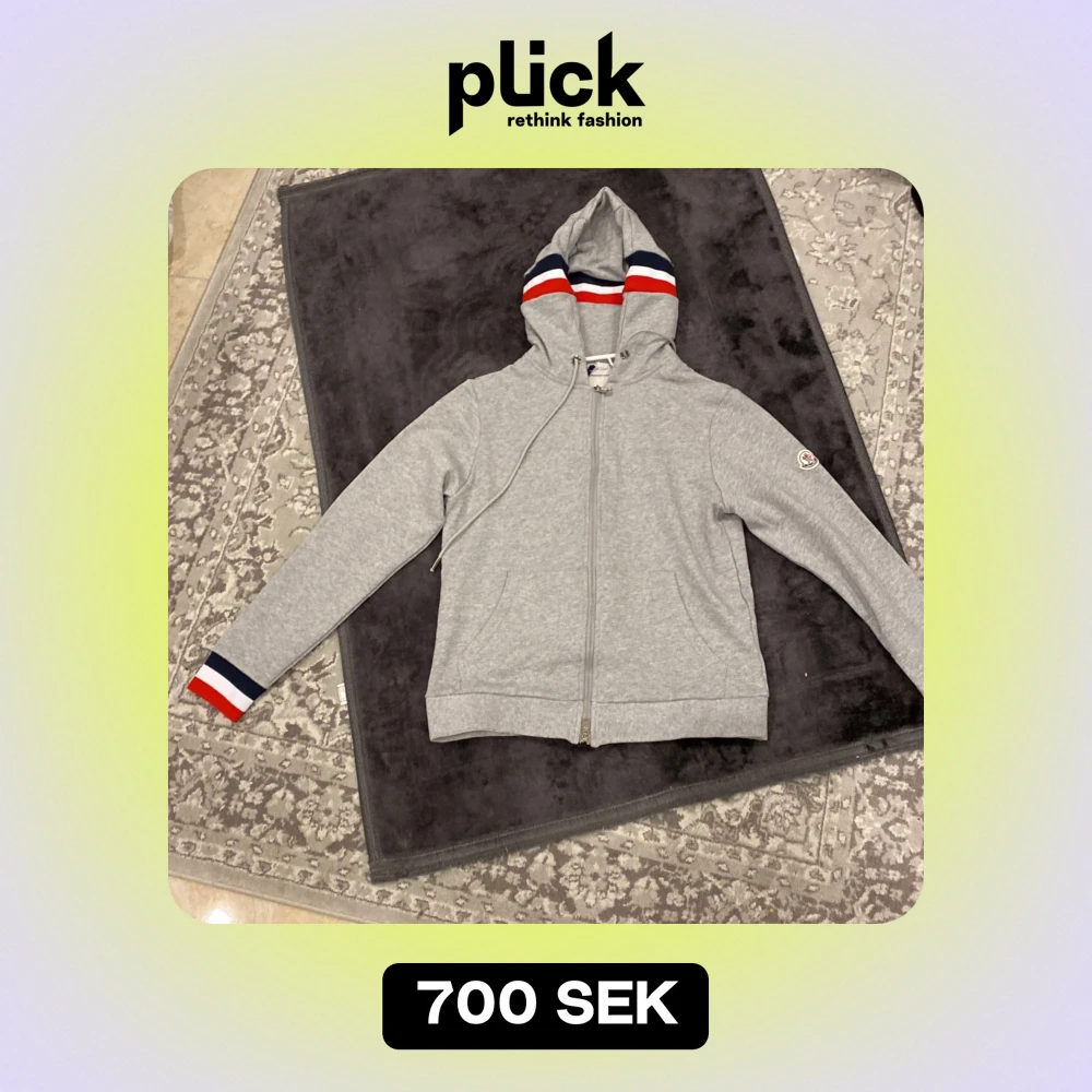 Säljer en snygg grå hoodie från Moncler i mycket bra skick. Den har en dragkedja framtill och coola ränder i rött, vitt och blått på huvan och ärmsluten. Perfekt för höst och vår när du vill vara både bekväm och stilren. Passar lika bra till vardags som till en chill festkväll.
