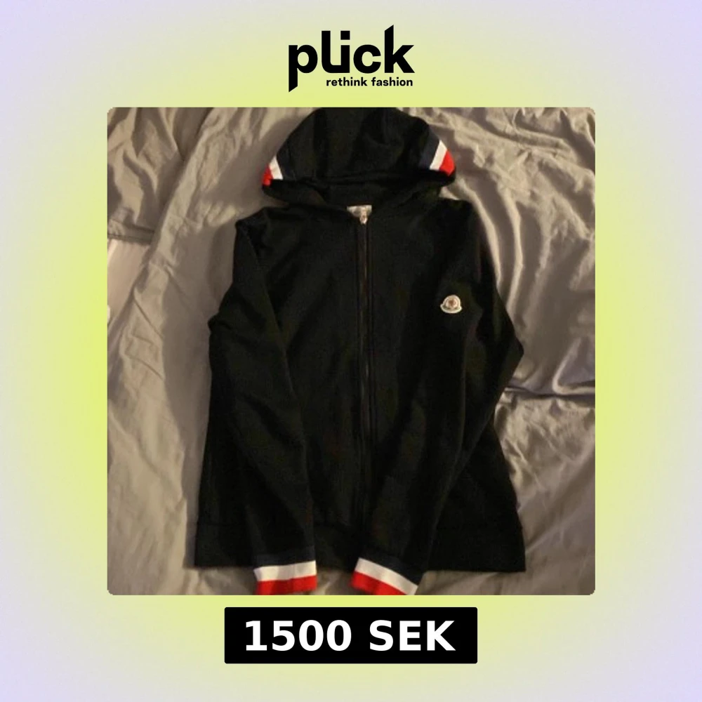 Svart hoodie från Moncler med dragkedja framtill och klassisk logga på bröstet. Huva och muddar har snygga ränder i rött, vitt och blått. Tillverkad i mjuk bomull, perfekt för en stilren och sportig look. Storleken är XL men sitter som en M