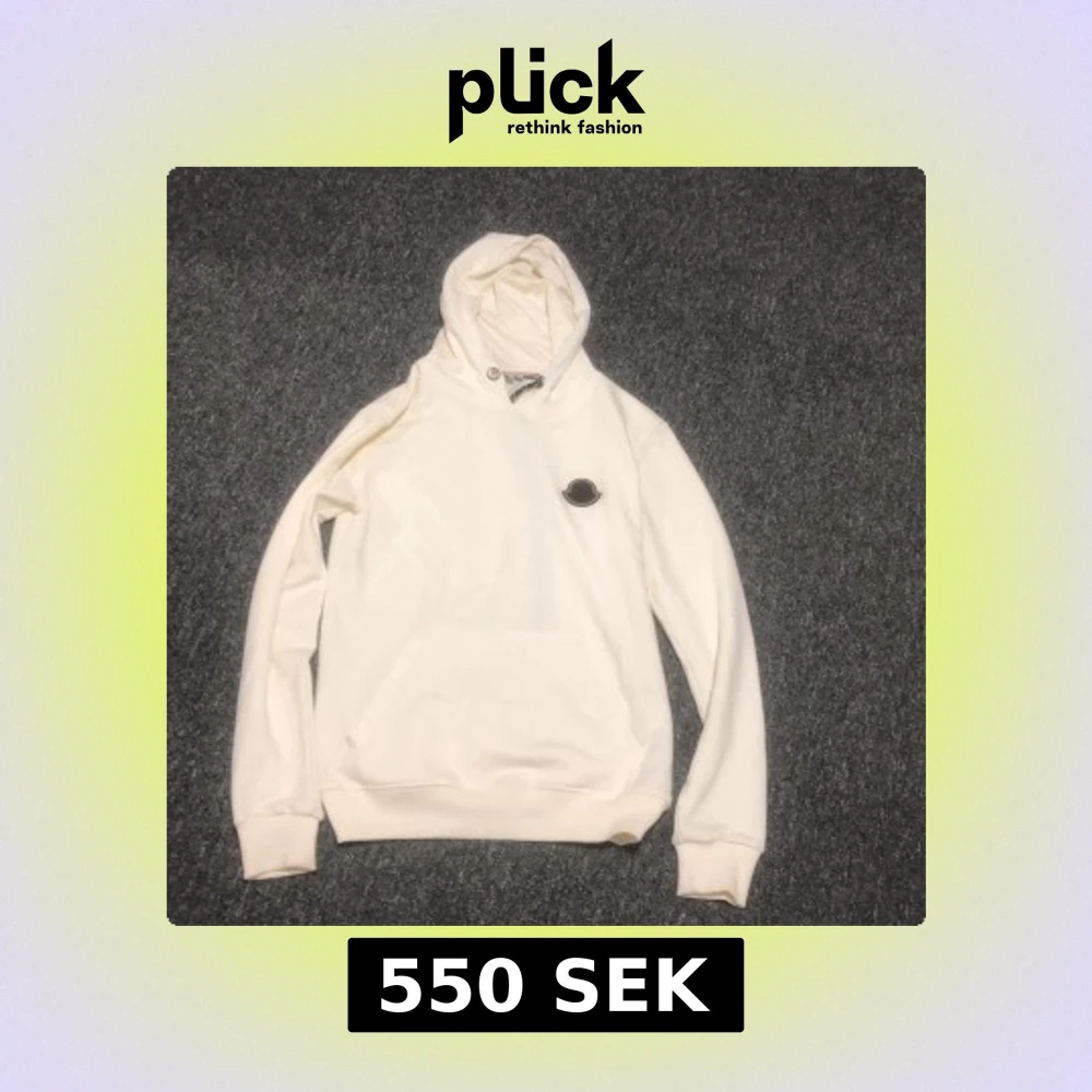 Säljer en stilren vit hoodie från Moncler med svart och gul Moncler-logga på bröstet. Tröjan har huva, känguruficka och ribbade muddar. Perfekt för dig som gillar exklusiva streetwear-plagg med clean look.
