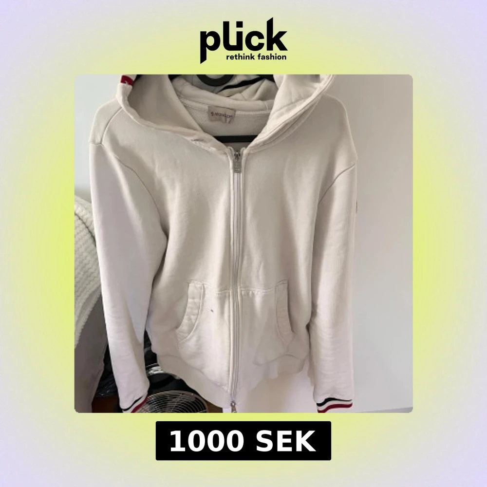 Säljer en clean vit hoodie från Moncler med hel dragkedja och huva. Tröjan har fickor framtill och snygga ränder i rött, blått och vitt på huvan och ärmsluten. Perfekt för dig som gillar stilrena märkesplagg med sportig vibe.
