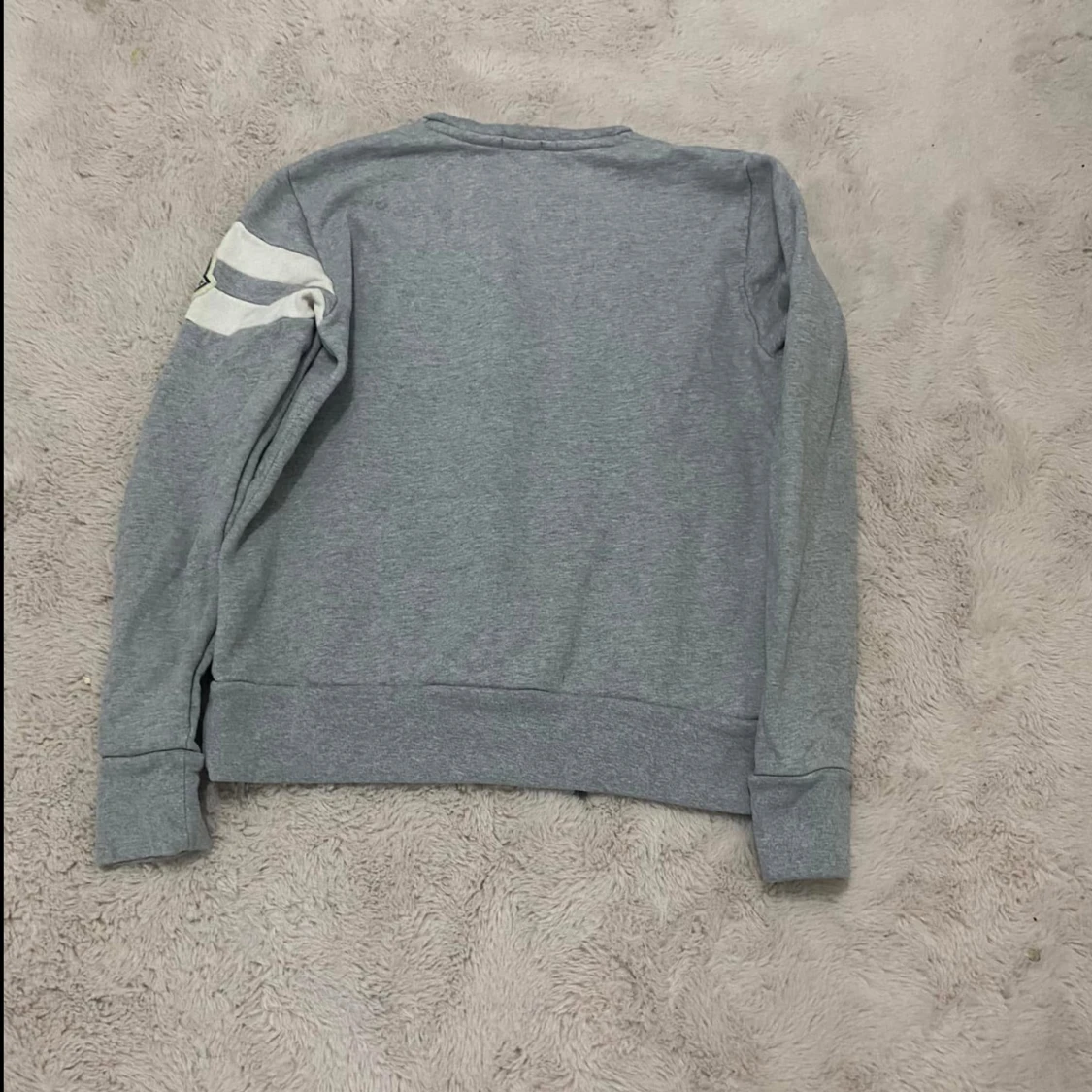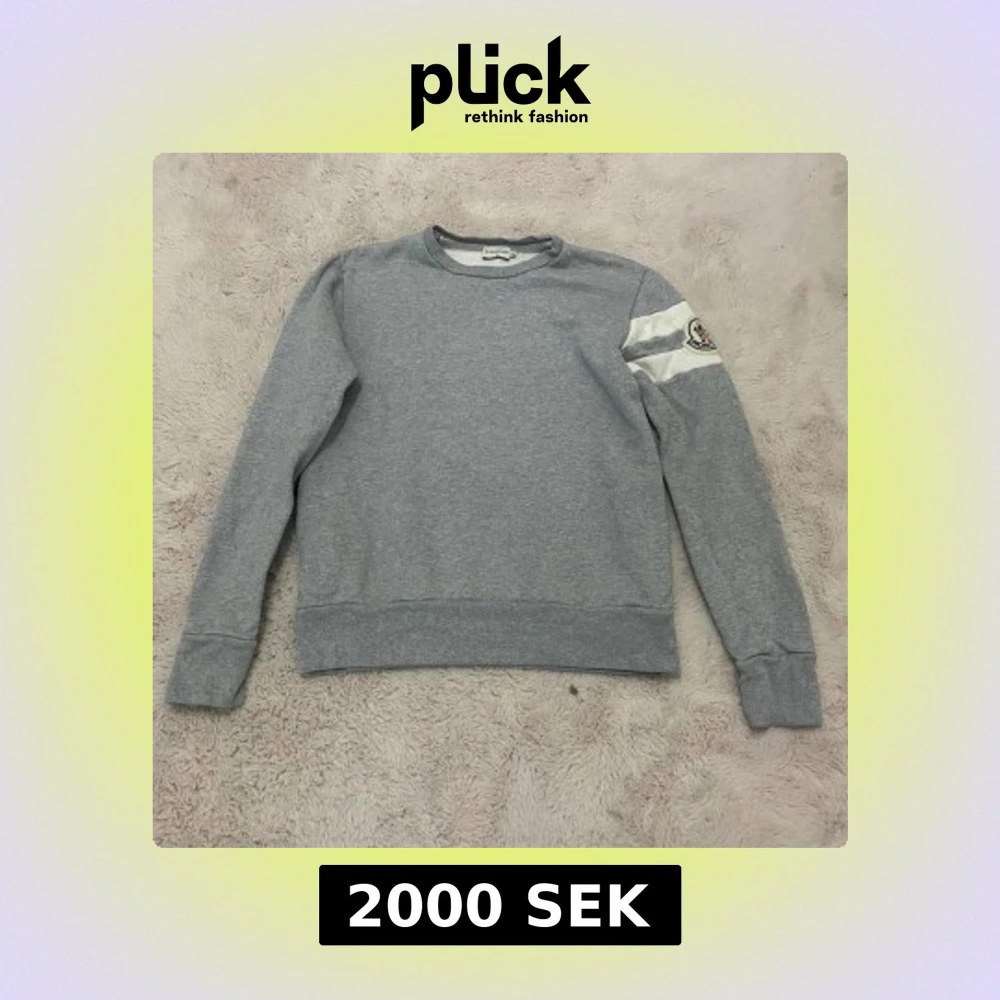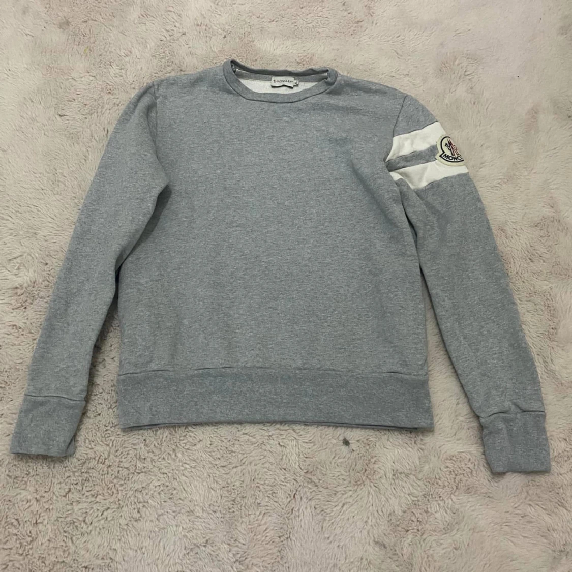 Säljer en stilren grå tröja från Moncler med vita detaljer på ärmen och en logotyp. Tröjan har långa ärmar och en rund halsringning. Perfekt för en avslappnad stil. Cond 9/10 Size XL fits M-L Pris 1600kr Köparen står för frakten!