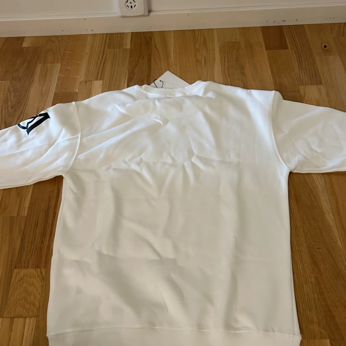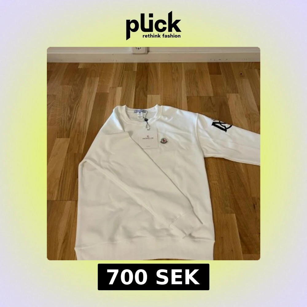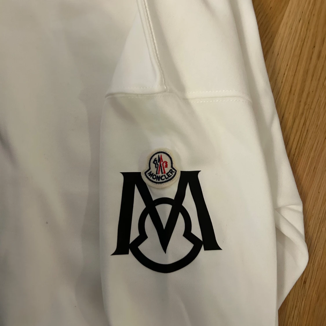 Snygg vit sweatshirt från Moncler med klassisk rund halsringning. Tröjan har Moncler-logga på bröstet och en stor svart M-logga på ena ärmen. Tillverkad i mjuk bomull och har ribbade muddar vid ärmslut och nederkant. Perfekt för en clean och stilren look.