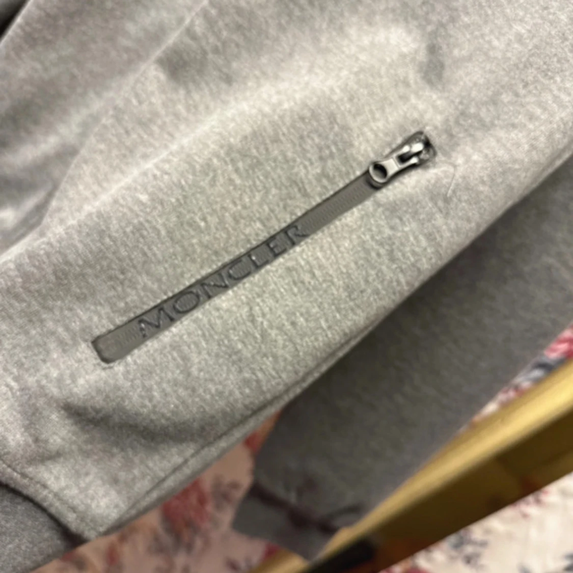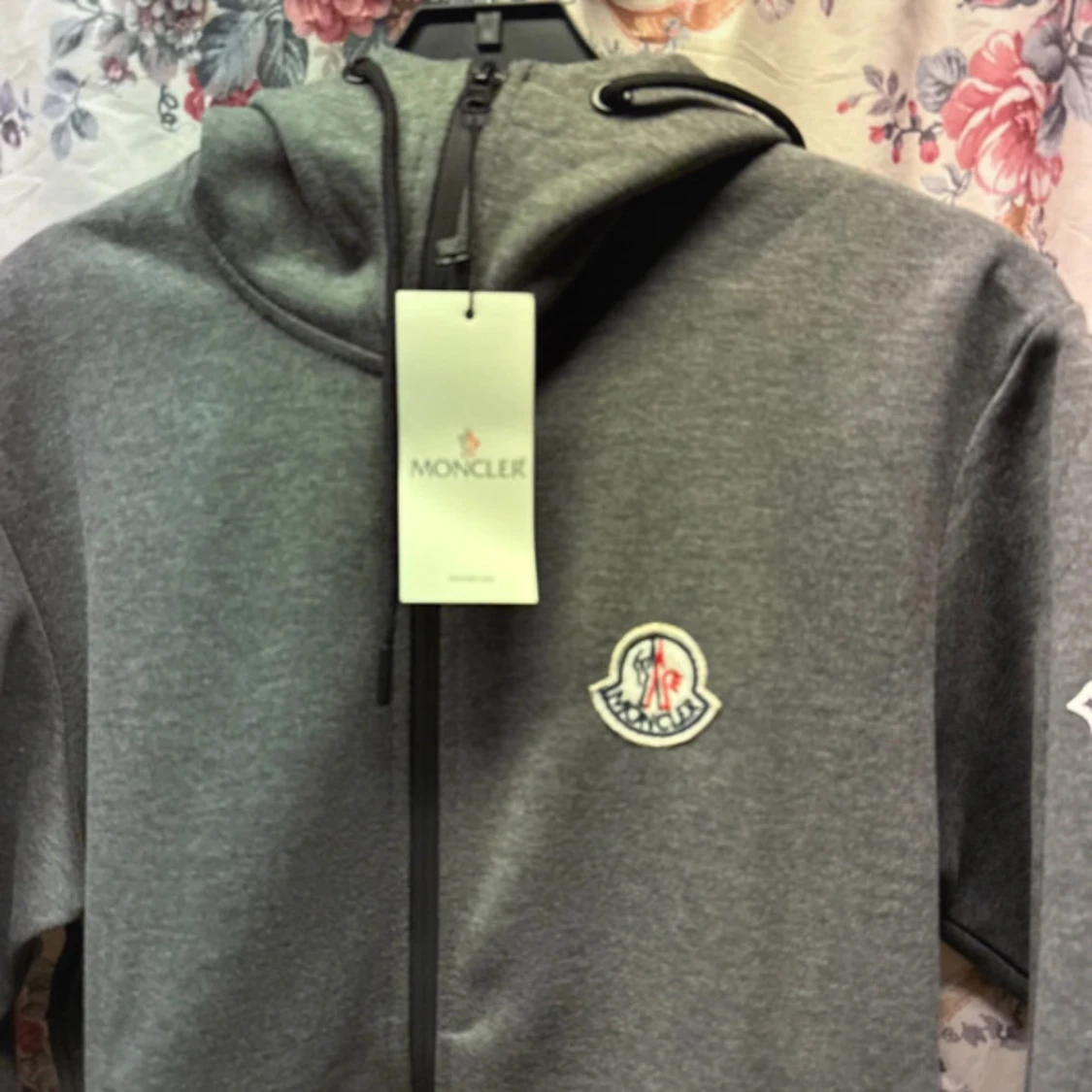 Säljer en grå hoodie från Moncler med huva och hel dragkedja framtill. Tröjan har Moncler-logga på bröstet, svarta dragkedjor på fickorna och ribbade muddar. Materialet är mjuk bomull och polyester, perfekt för chill dagar. Snygg och stilren design som funkar till allt.