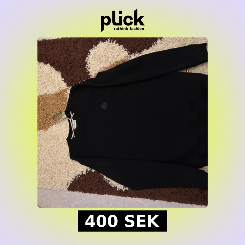Säljer en stilren svart sweatshirt från Moncler i storlek S. Tröjan har rund halsringning, diskret Moncler-logga på bröstet och klassiska ränder i kragen. Perfekt för dig som gillar enkel och snygg design.