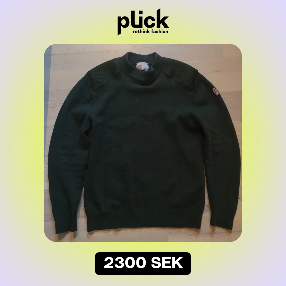 Säljer en snygg mörkgrön tröja från Moncler. Den är i mycket bra skick och perfekt för höst och vinter. Tröjan har långa ärmar och en broderad logga på ärmen. Den är gjord i ett mjukt och bekvämt material, perfekt för kyliga dagar.