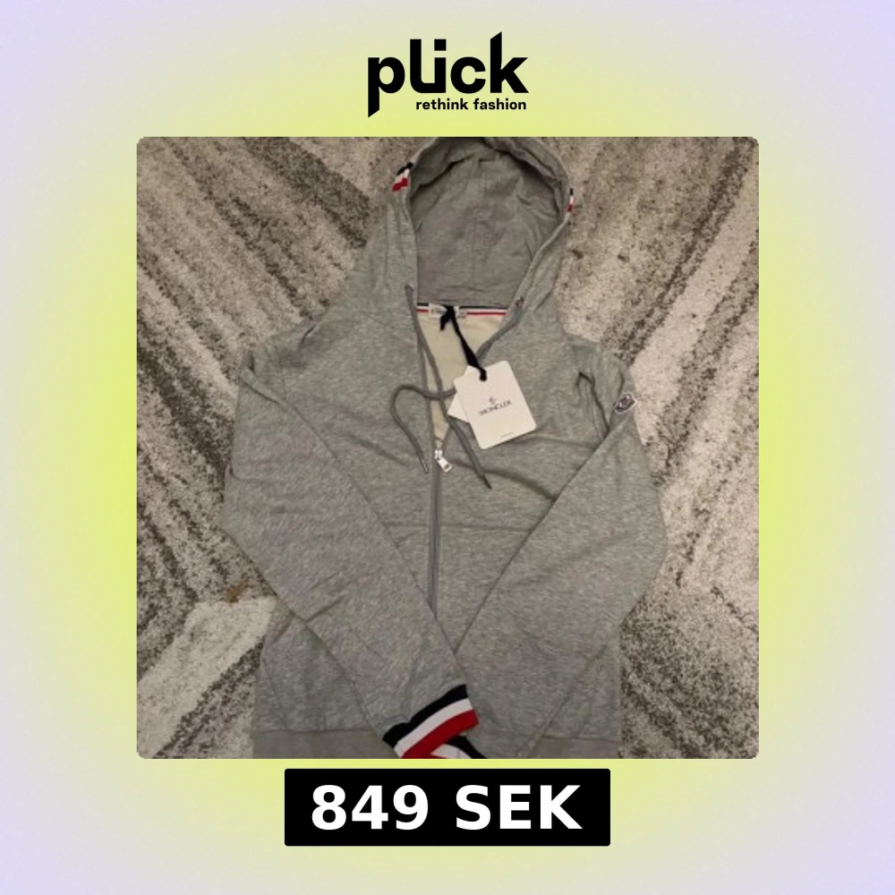 Snygg grå hoodie från Moncler med hel dragkedja, huva och snörning. Tröjan har långa ärmar och Moncler-logga på ärmen. Ribbade muddar med röd, vit och marinblå rand ger en sportig touch. Perfekt för dig som gillar stilren streetwear.