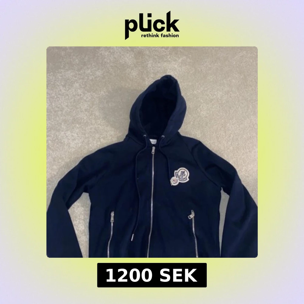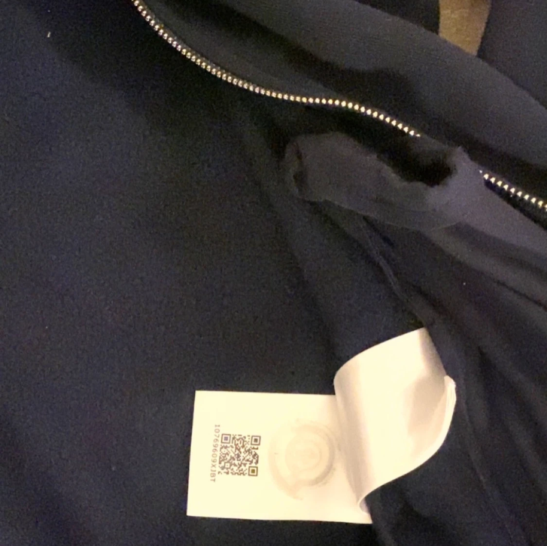 Snygg mörkblå hoodie med dragkedja och huva. Den har ett broderat märke på bröstet och praktiska fickor med dragkedja. Perfekt för en avslappnad stil.