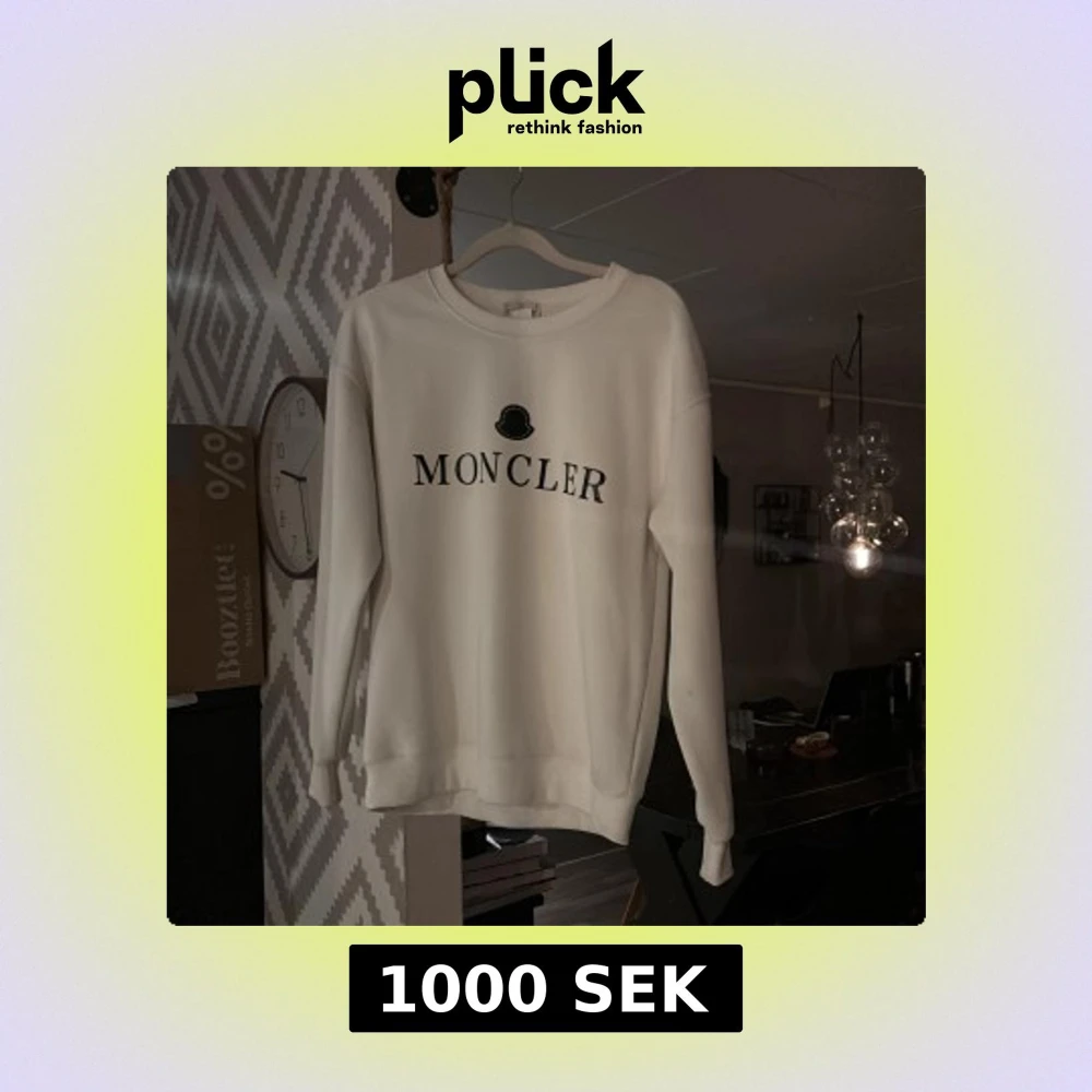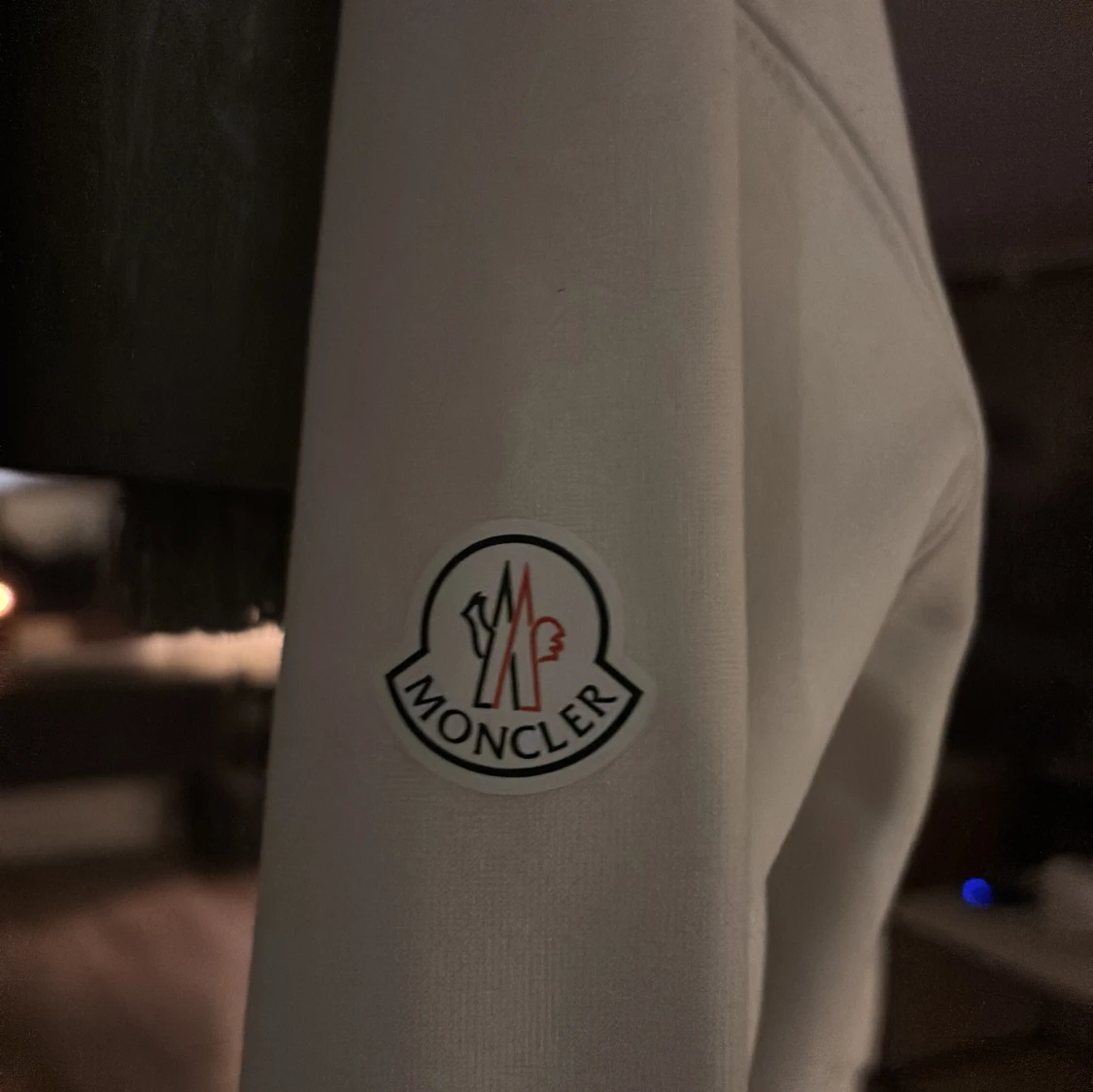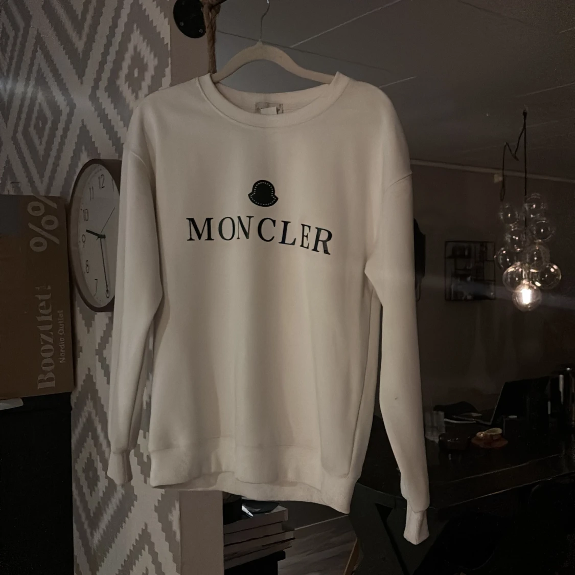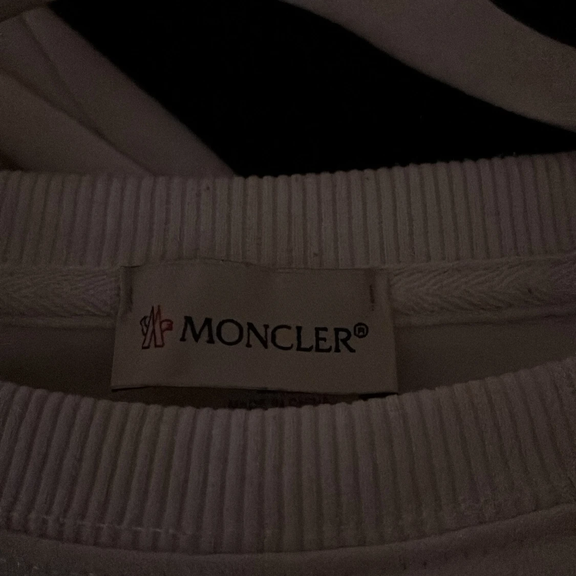 Säljer denna feta Moncler tröja eftersom att jag har växt ut den. Den har två små blåa fläckar men inget som syns när man har på sig den. Storleken är S men passar också xs skulle jag säga. Hör av dig vid frågor!