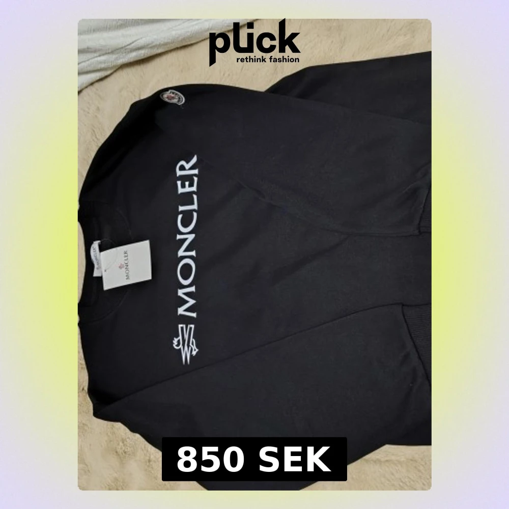 Snygg svart sweatshirt från Moncler med stort vitt Moncler-tryck på bröstet och klassisk Moncler-logga på ärmen. Tröjan har rund halsringning och ribbade muddar. Perfekt för dig som gillar streetwear och exklusiva märken.
