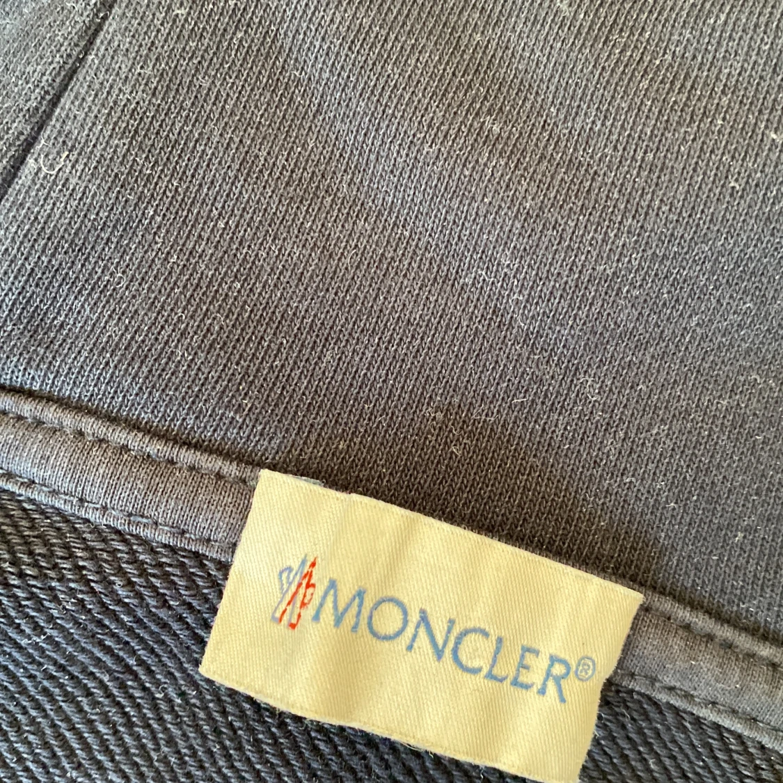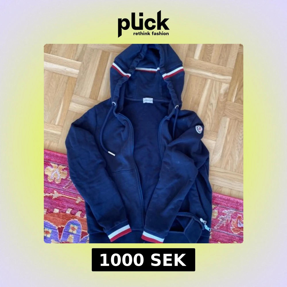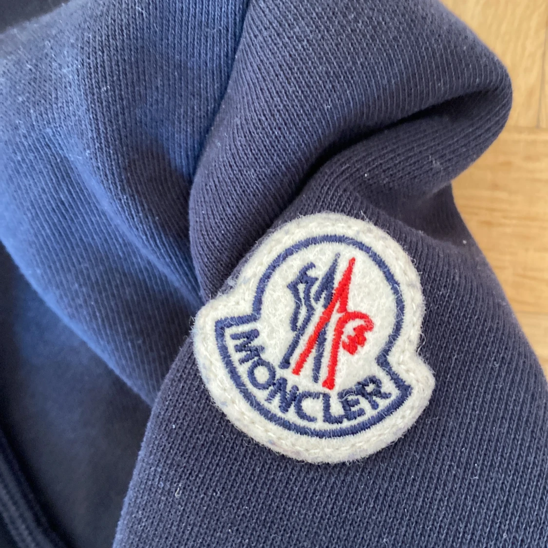 Säljer en snygg mörkblå hoodie från Moncler med dragkedja och huva. Den har ribbade muddar och ett Moncler-märke på ärmen. Perfekt för en casual look.