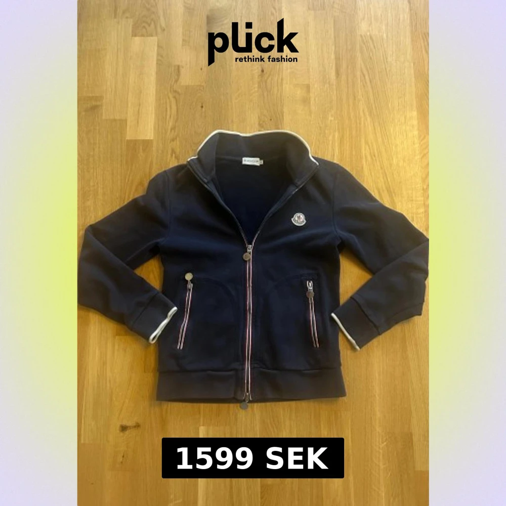 !!ÄKTA!! Snygg mörkblå zip-jacka från Moncler (köpt från Von Greven Closet)med vita och röda detaljer på dragkedjorna och kragen. Jackan har Moncler-logga på bröstet, två fickor med dragkedja och ribbade muddar. Perfekt för dig som gillar stilrena och sportiga plagg.