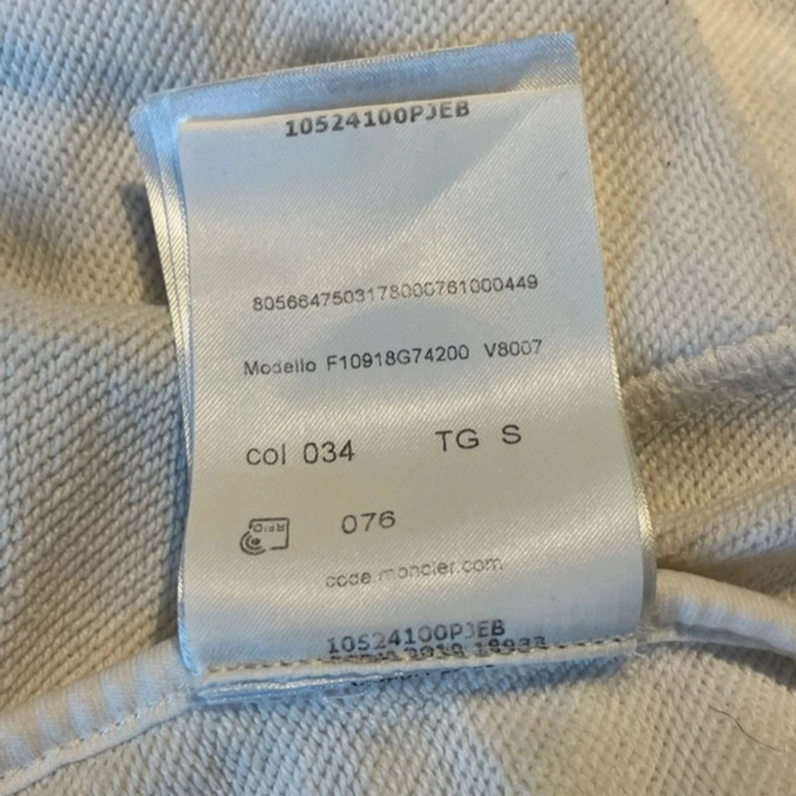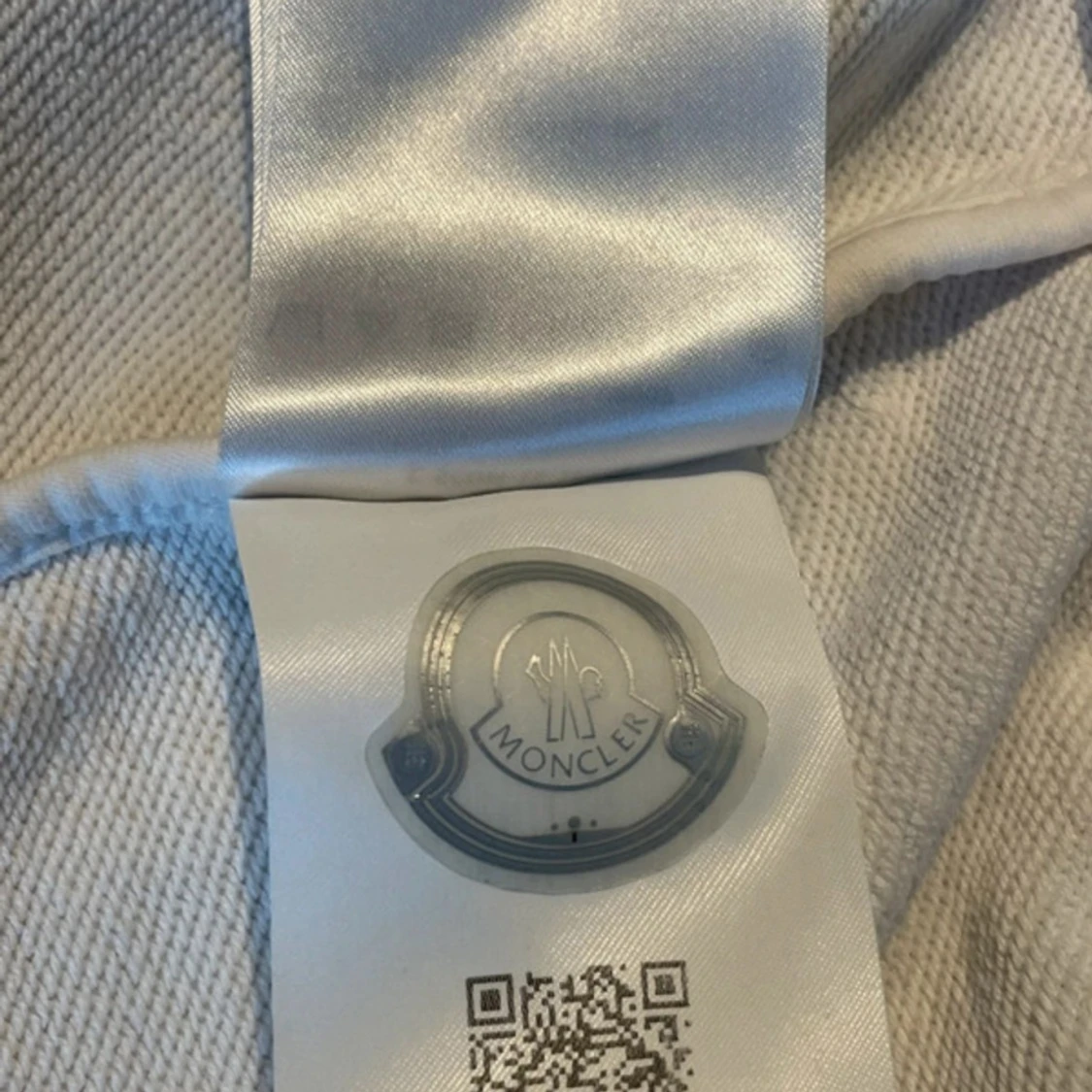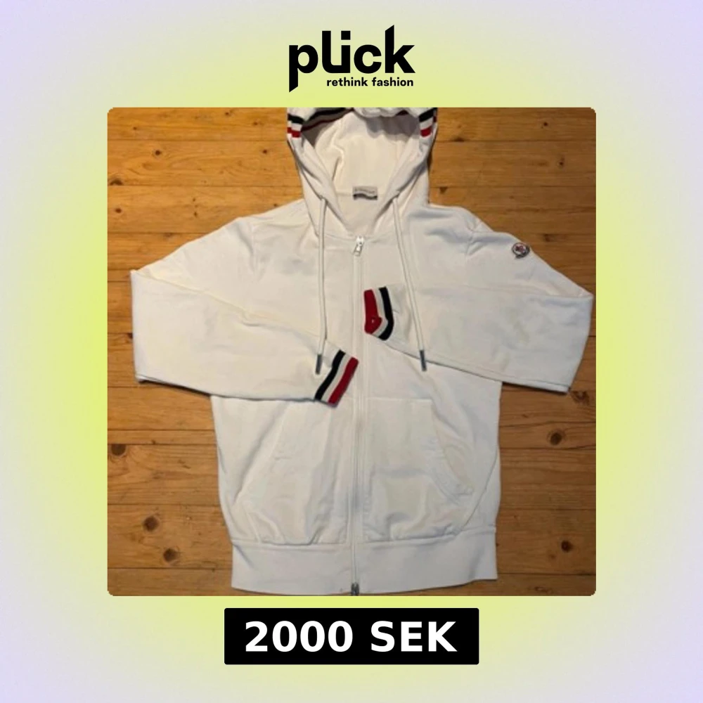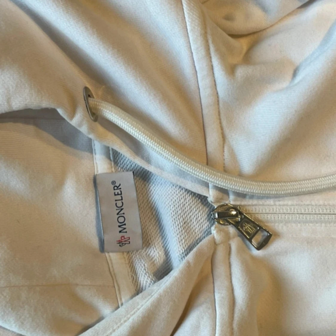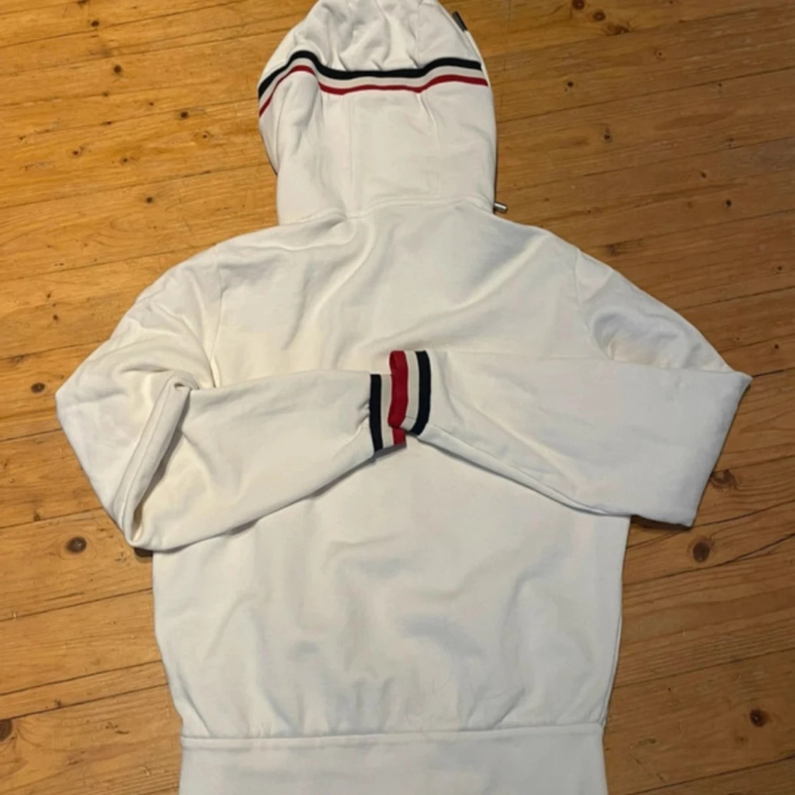 Vit hoodie från Moncler med hel dragkedja, huva och fickor framtill. Ribbade muddar och huva med röda, blå och vita ränder. Klassisk Moncler-logga på ärmen. Perfekt för dig som gillar stilren streetwear med exklusiv känsla. Inga defekter, väldigt eftertraktad hoodie säljer nu den för ett bra pris. (Äkta) fraktar inom 24 timmar.