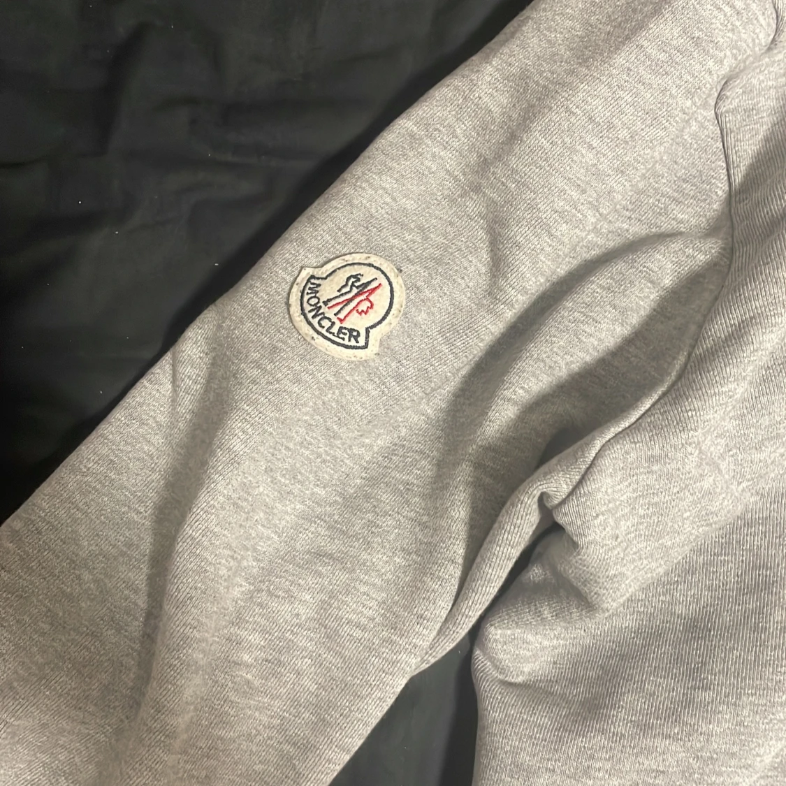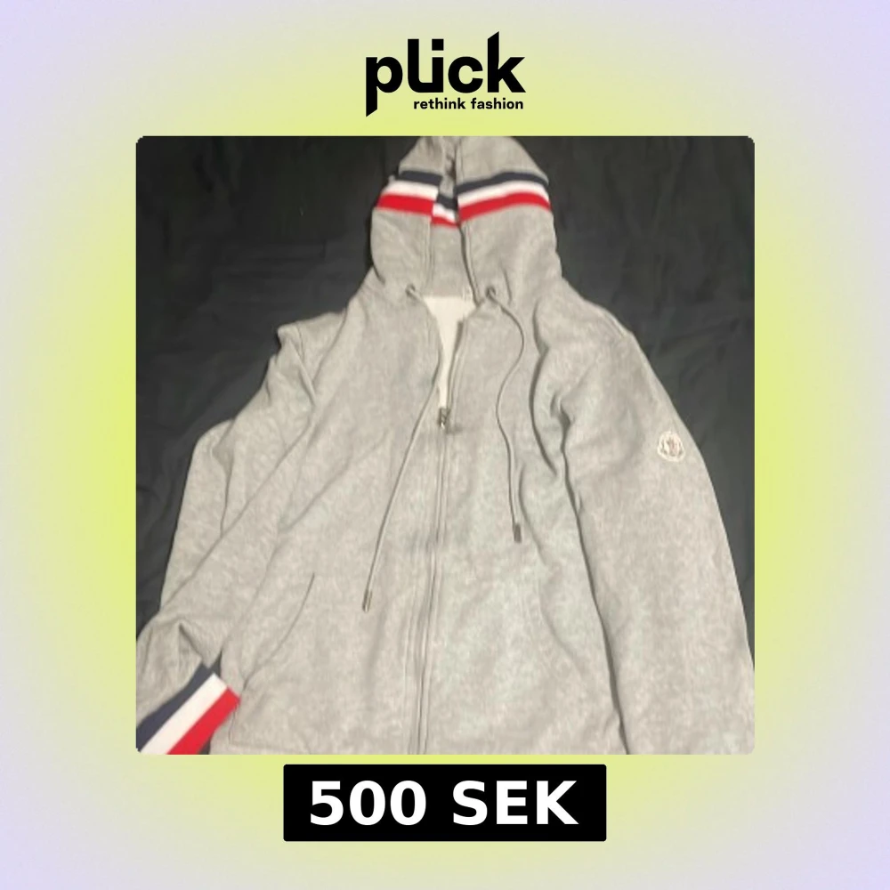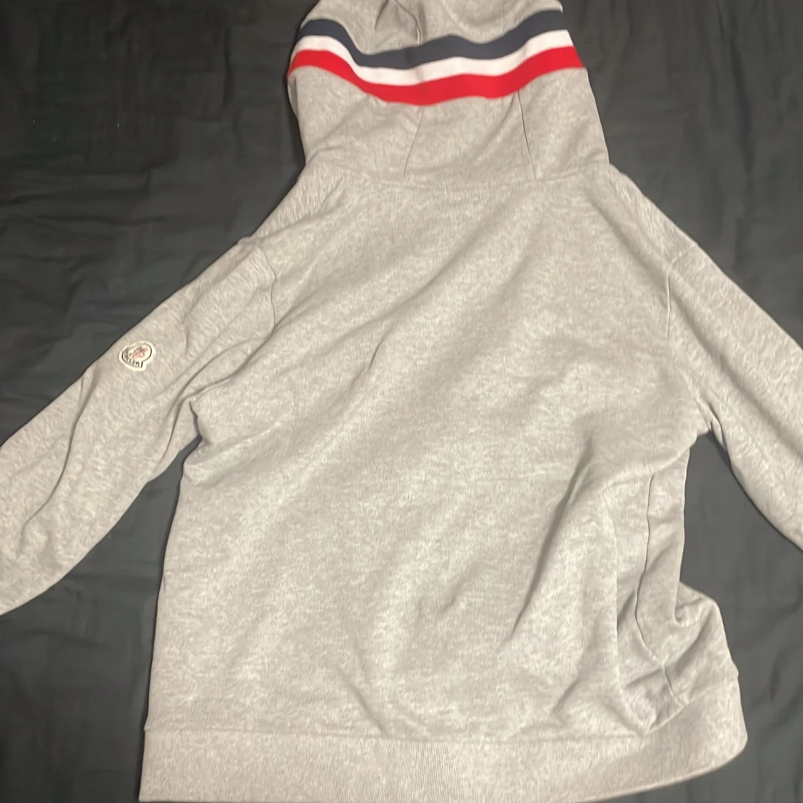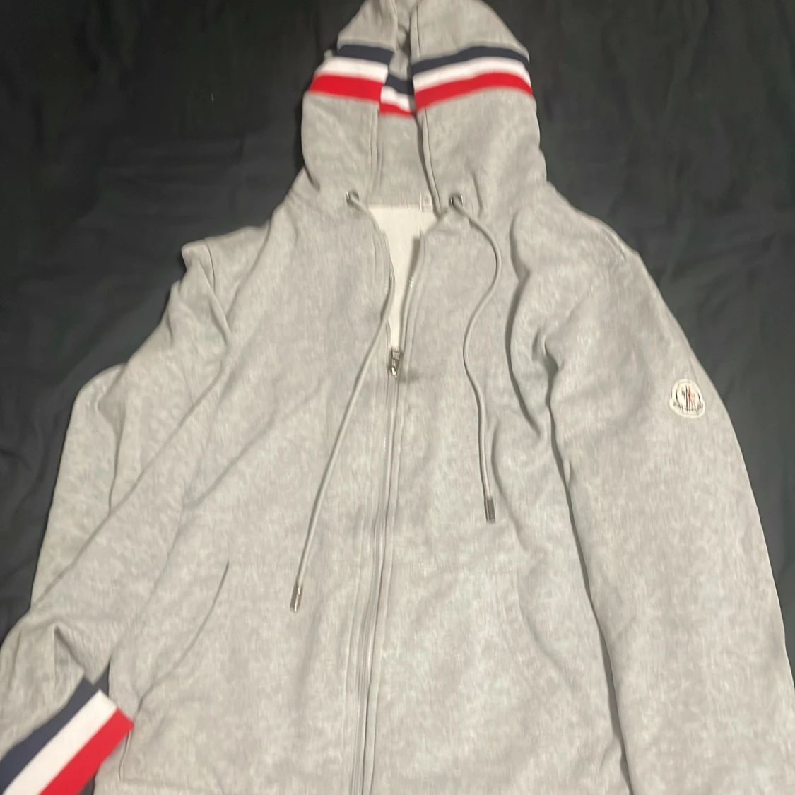Säljer en stilren grå hoodie från Moncler med dragkedja och broderad logga på ärmen. Huvan har ränder i rött, vitt och blått som ger en sportig touch. Perfekt för kyliga dagar!