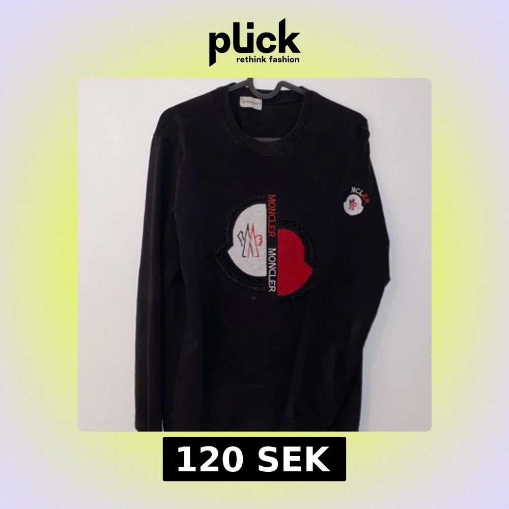 Säljer en svart långärmad tröja från Moncler med ett stort broderat märke i rött och vitt på framsidan. Tröjan har rund hals och en mindre logga på ärmen. Perfekt för kyliga dagar!