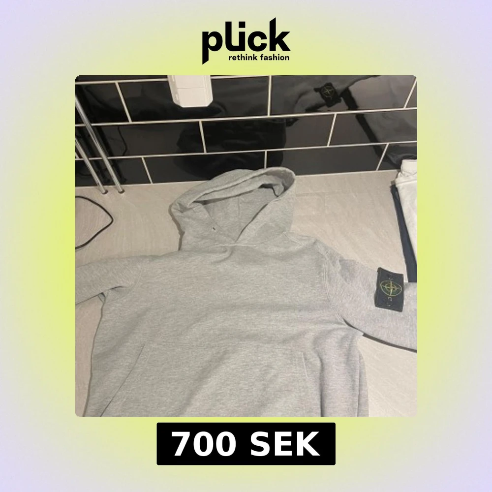 Säljer en stilren grå hoodie från Stone Island med klassisk logga på ärmen. Tröjan har huva, känguruficka och är tillverkad i mjuk bomull. Perfekt för dig som gillar streetwear och vill ha något bekvämt och snyggt.