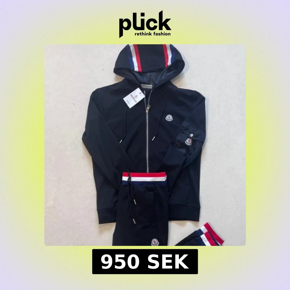 Säljer en svart hoodie från Moncler med dragkedja och huva. Tröjan har röda, vita och blå detaljer på huvan och midjan samt Moncler-logga på bröstet och ärmen. Perfekt för en sportig och stilren look.