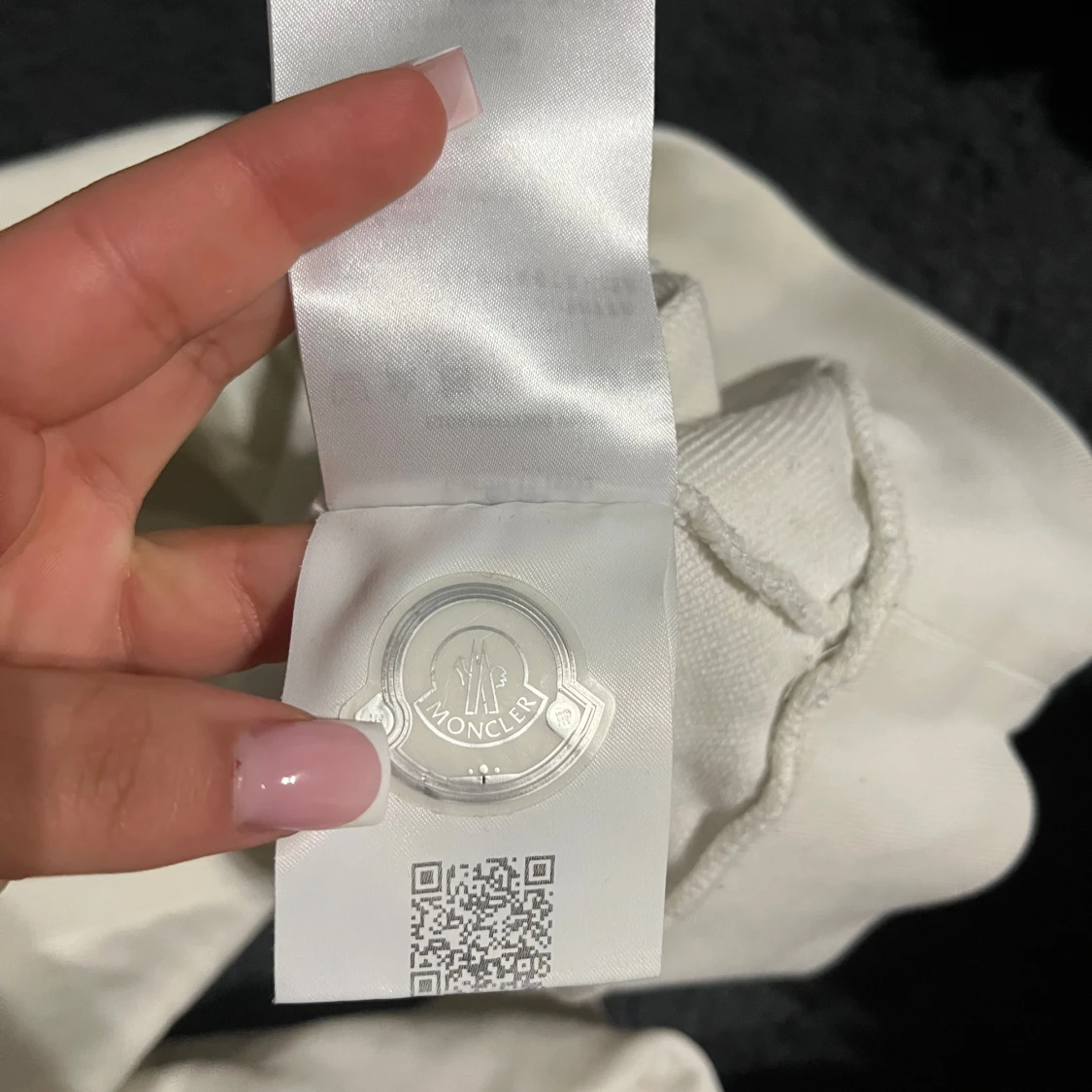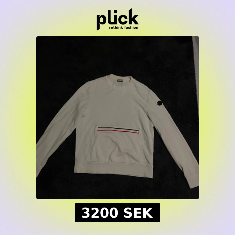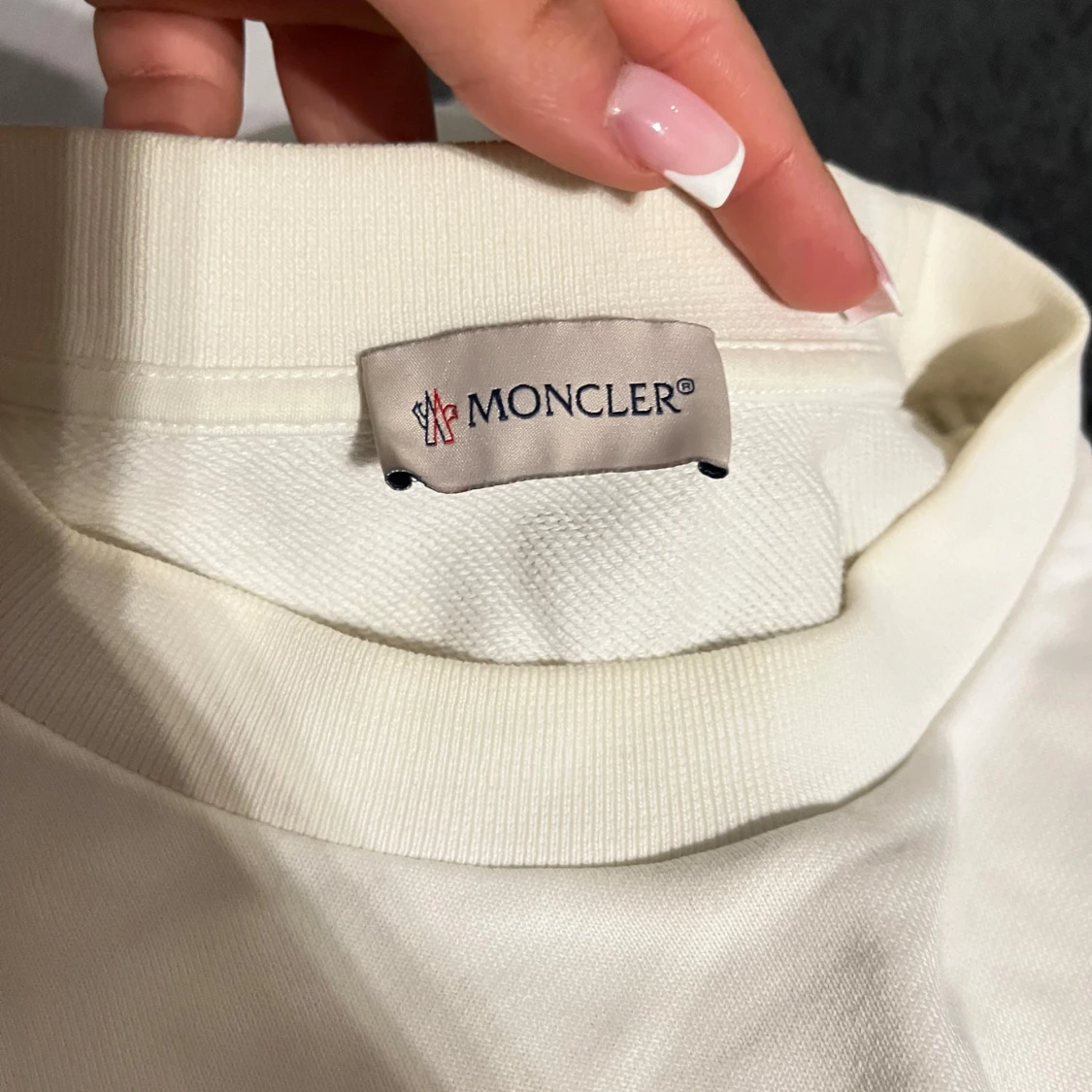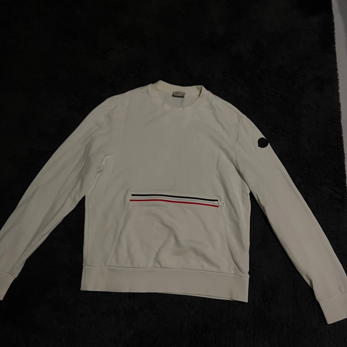 Säljer en stilren vit tröja från Moncler med en unik dragkedja i rött, vitt och blått på framsidan. Tröjan har långa ärmar och en rund halsringning.