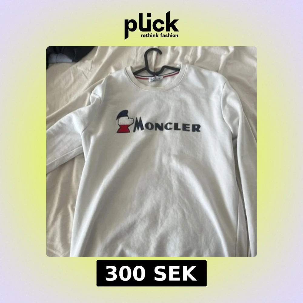 Säljer en stilren vit långärmad tröja från Moncler med deras ikoniska logotyp tryckt på framsidan. Perfekt för en avslappnad och trendig look. Tröjan har en rund halsringning och är tillverkad i ett mjukt material.