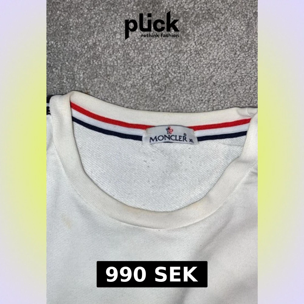 Vit långärmad tröja från Moncler i storlek XL. Snygga svarta band med Moncler-logga längs båda ärmarna och en krage med röd, vit och blå detalj. Tröjan har en klassisk passform och är tillverkad i mjuk bomull som känns skön mot huden.