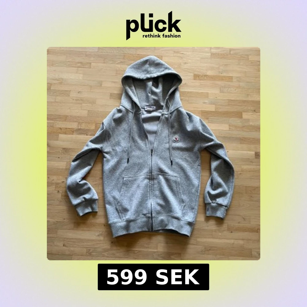 Snygg grå hoodie från Moncler med dragkedja framtill, huva med snörning och klassisk logga på bröstet. Tröjan har ribbade muddar och två fickor framtill. Perfekt för en chill och stilren look.