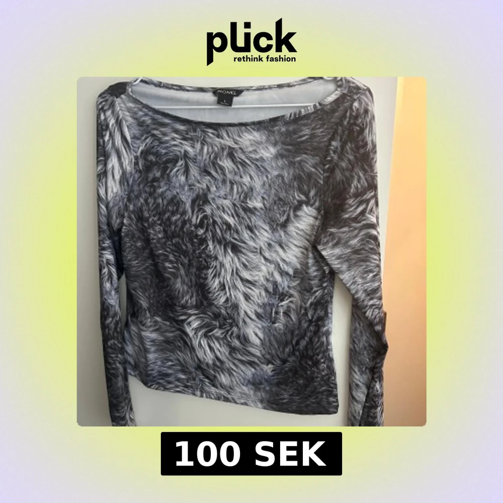 Långärmad topp från Monki med grått och svart pälsliknande mönster. Tunn och stretchig. Rund halsringning och figurnära passform.