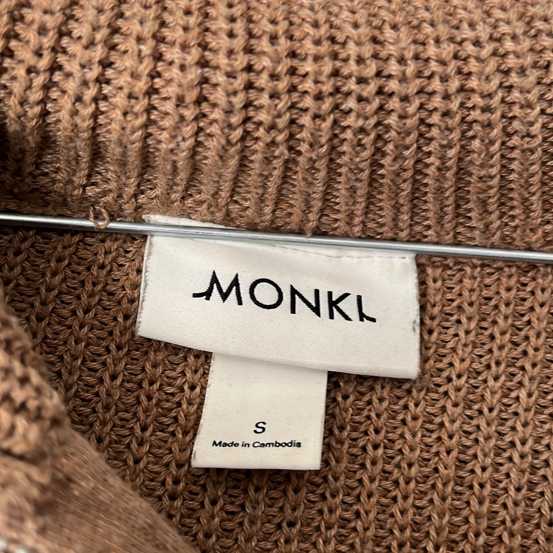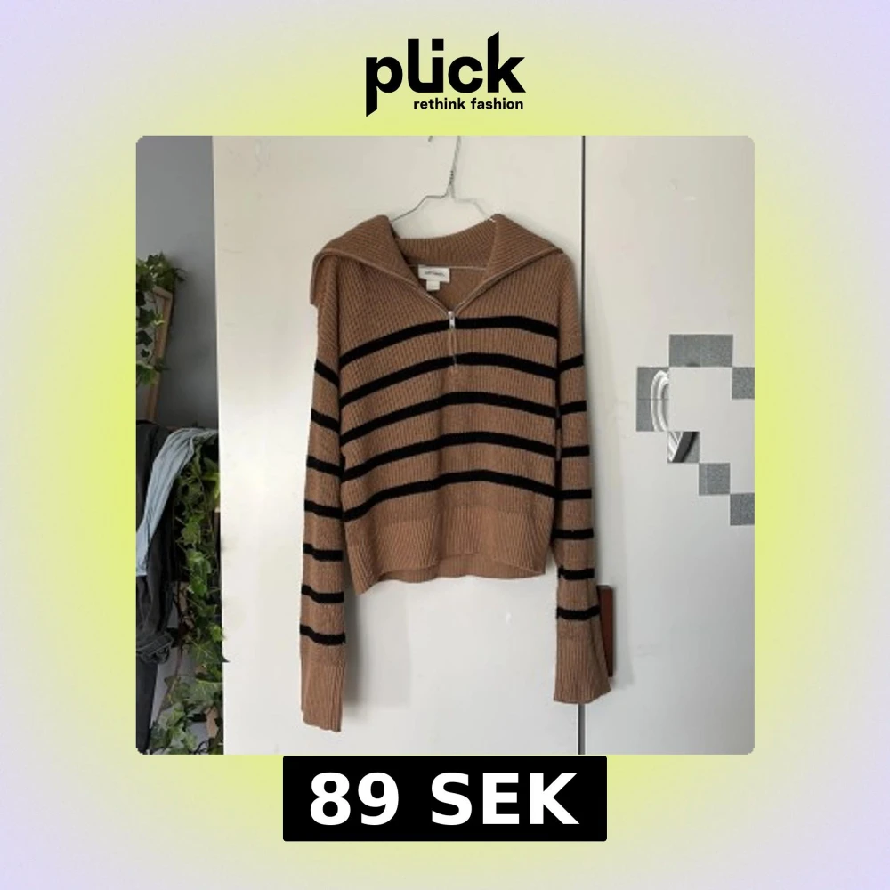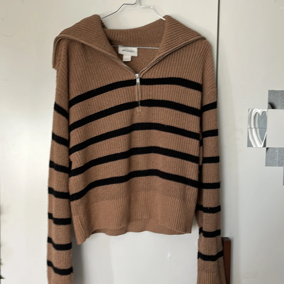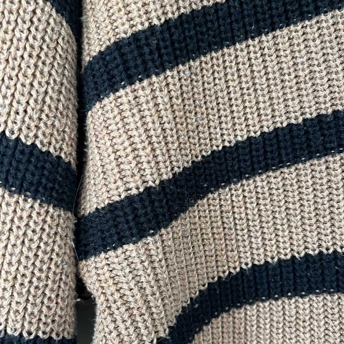 Säljer en stickad tröja från Monki i beige med svarta ränder. Tröjan har halv dragkedja framtill, krage och långa ärmar. Perfekt för lager-på-lager och har en avslappnad passform.