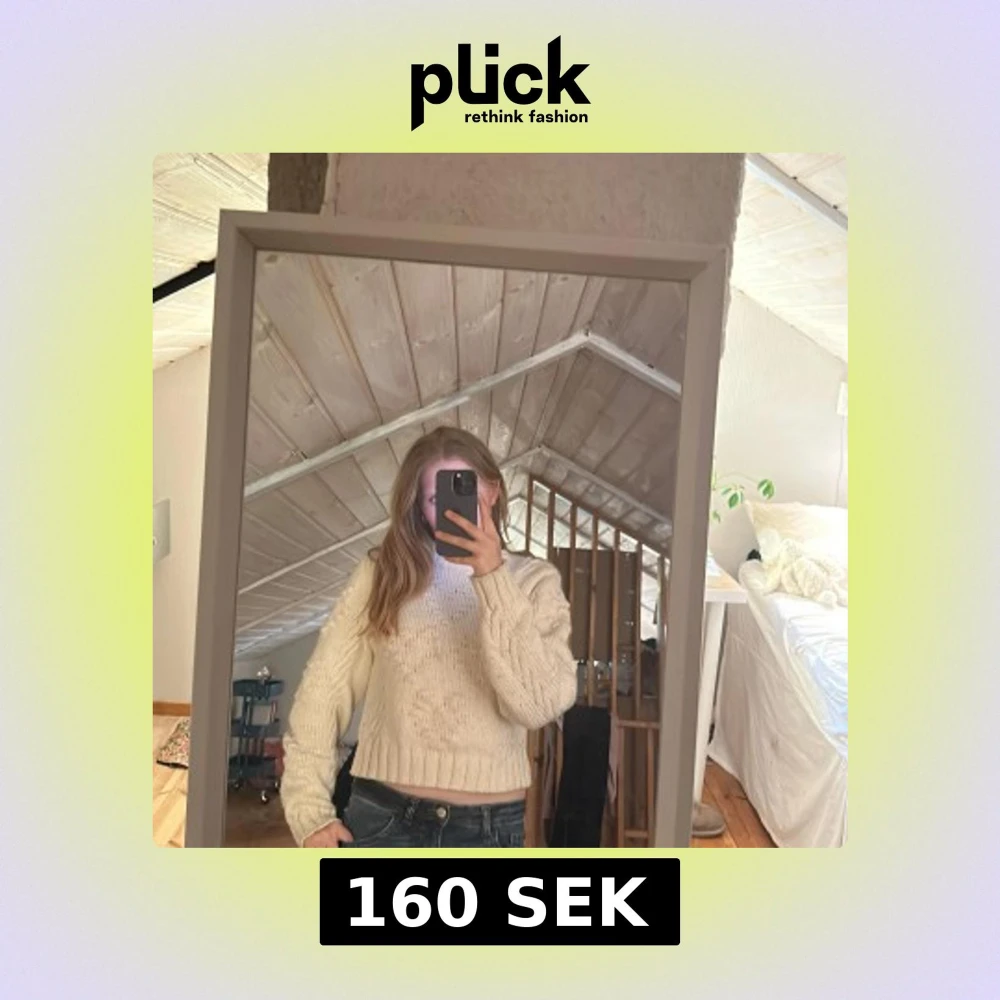 Säljer en krämvit stickad tröja från Monki i storlek S. Tröjan har ett diskret hjärtmönster, ribbade muddar och är croppad i modellen. Perfekt för kyligare dagar och enkel att matcha med jeans eller kjol.