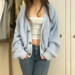Säljer en mysig ljusblå kofta med stora knappar framtill. Koftan har en lös passform och är perfekt för kyligare dagar. Den är stickad och har långa ärmar som ger en avslappnad look.