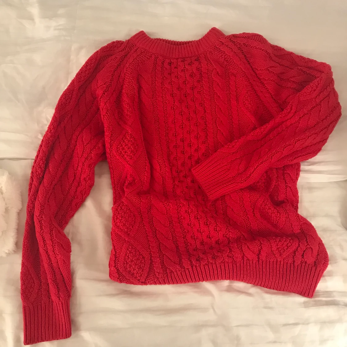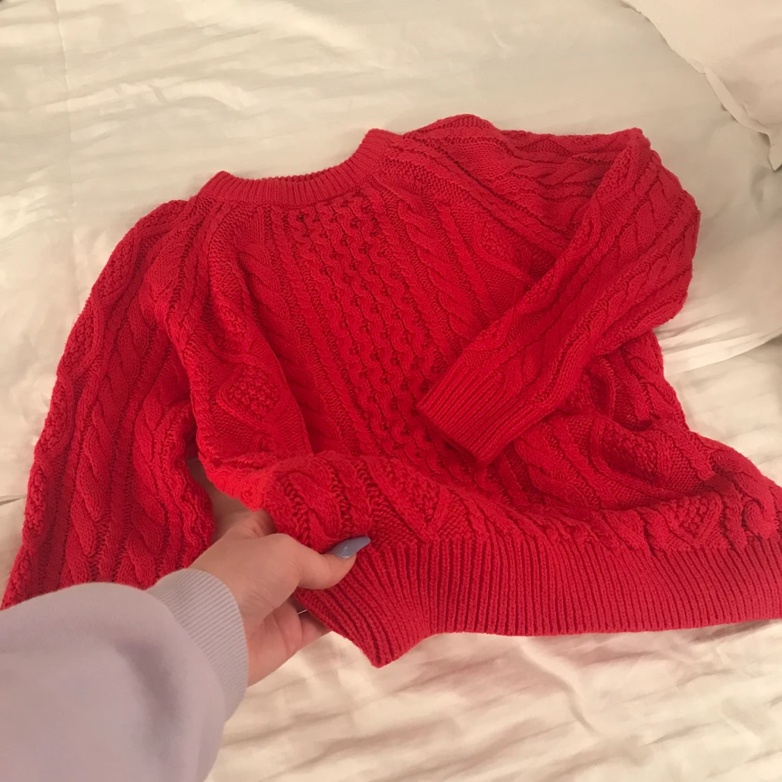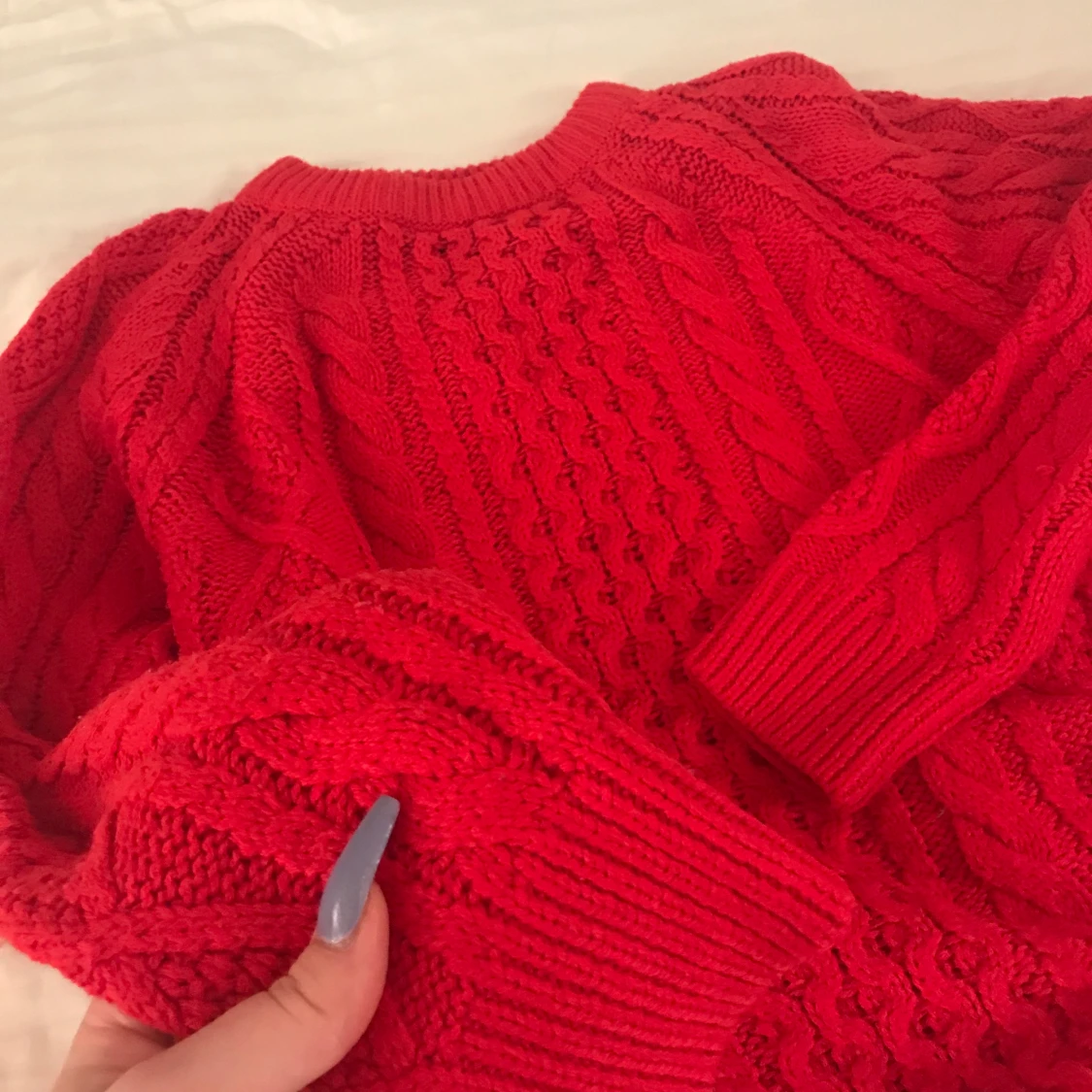 Röd tjockt stickad tröja i mycket skönt material, sitter ”löst” men skulle inte kategorisera den som over-sized. Mycket gott skick! Skriv privat för fler bilder/mer info ❣️