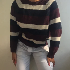 Jättefin å skön stickad tröja med vinrött, marinblått och vitt!