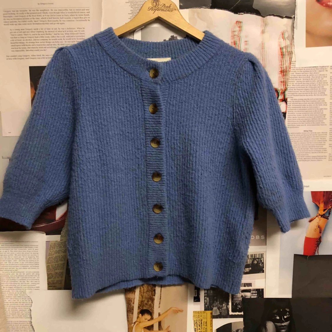 Jättefin blå/lila kortärmad kofta med knappar från monki, använd fåtal gånger, så gott som ny. Nypris 400.