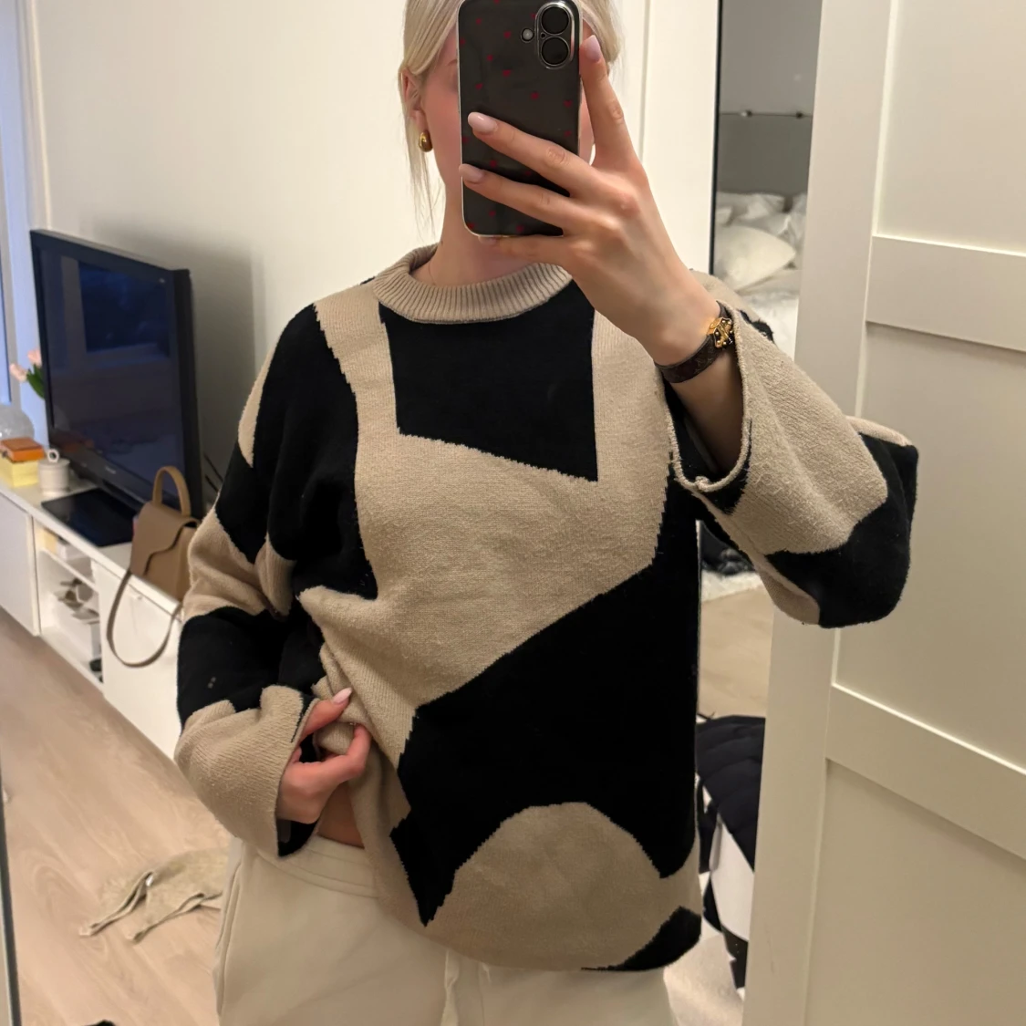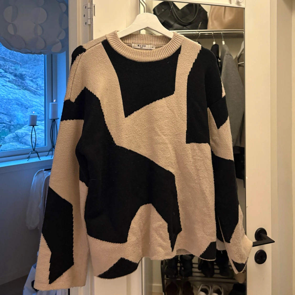 Så fin overzised mönstrad tröja i svart och beige från NA-KD, i fint skick (lite smått nopprig på vissa delar, se sista bilden) 💕Köpt för 799kr, Använd gärna köp nu! 😊
