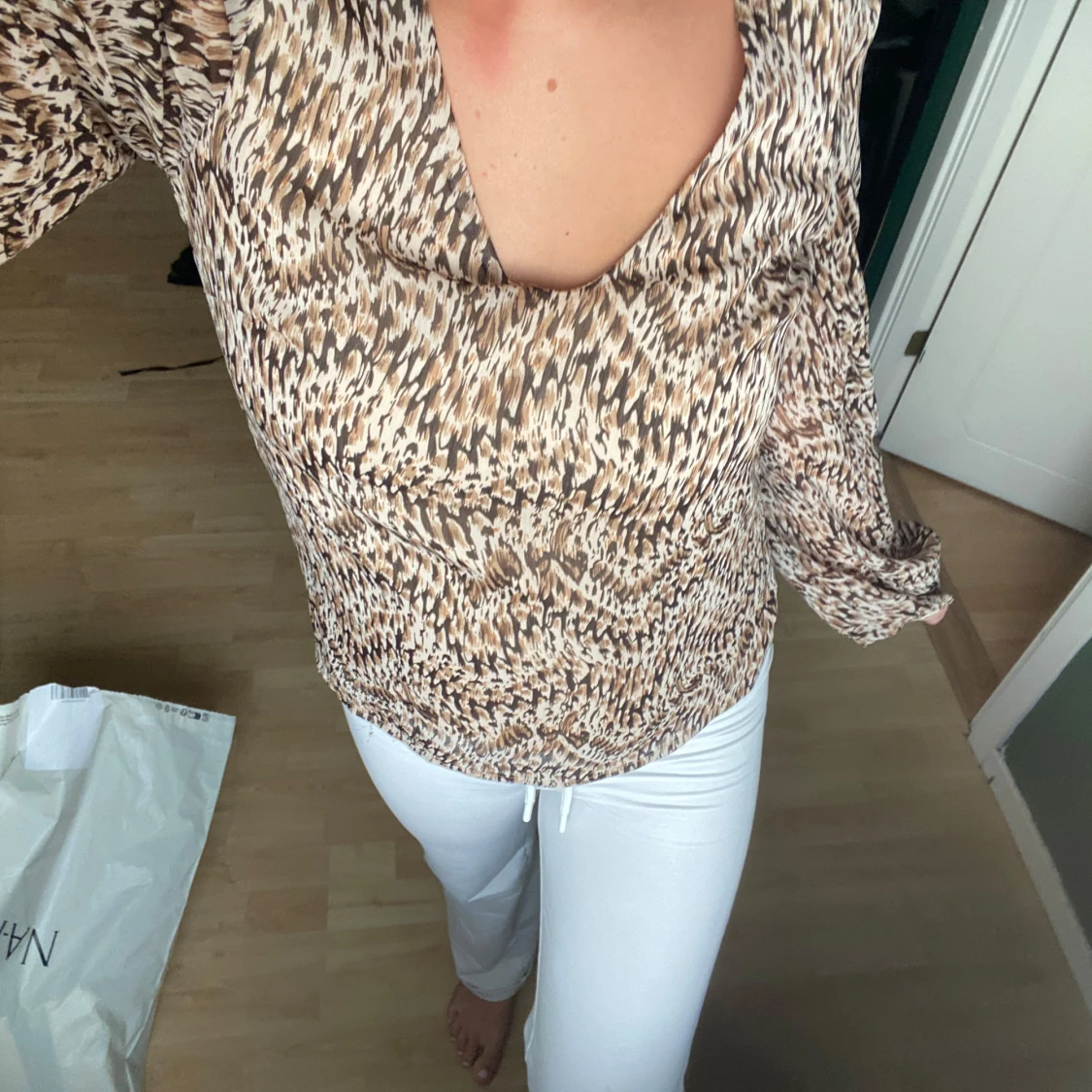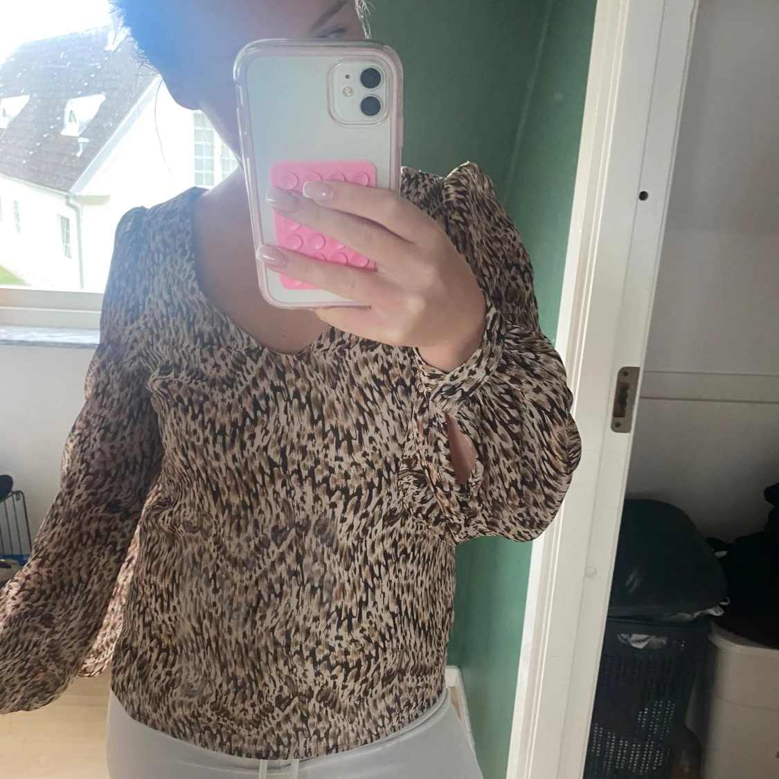 Säljer en snygg blus med v-ringning och långa ärmar. Blusen har ett brunt och beige mönster som påminner om djurprint och är tillverkad i ett lätt, flowy material. Ärmarna har en liten knapp vid handleden för extra detalj. perfekta höstfärger som passar fint i höstgarderoben!!