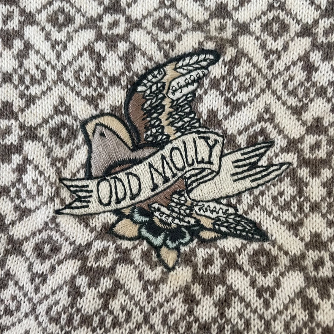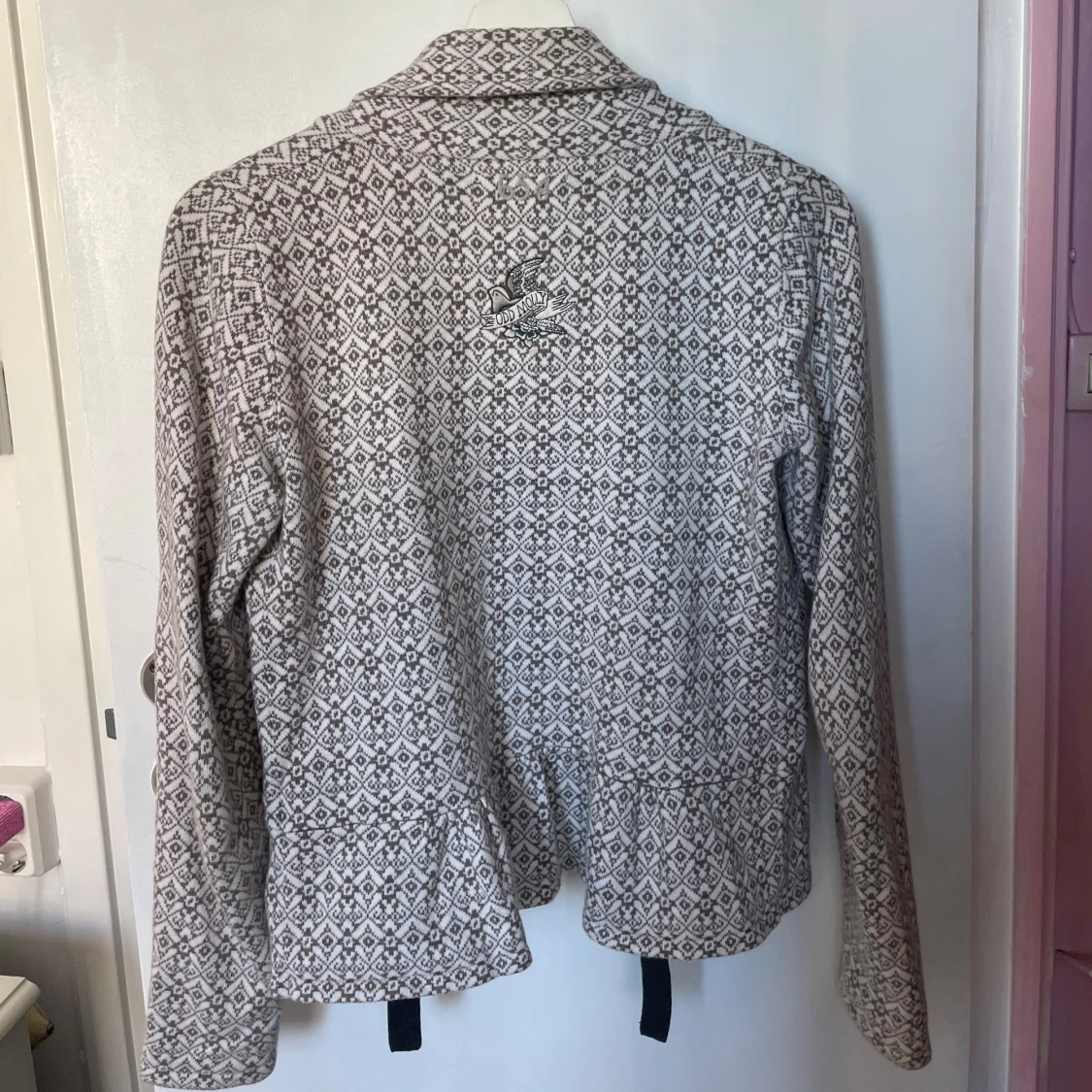 Säljer en snygg mönstrad kofta från Odd Molly i beige och brun. Koftan har ett fint mönster och knyts med ett svart band framtill. Perfekt för att ge din outfit en unik touch.