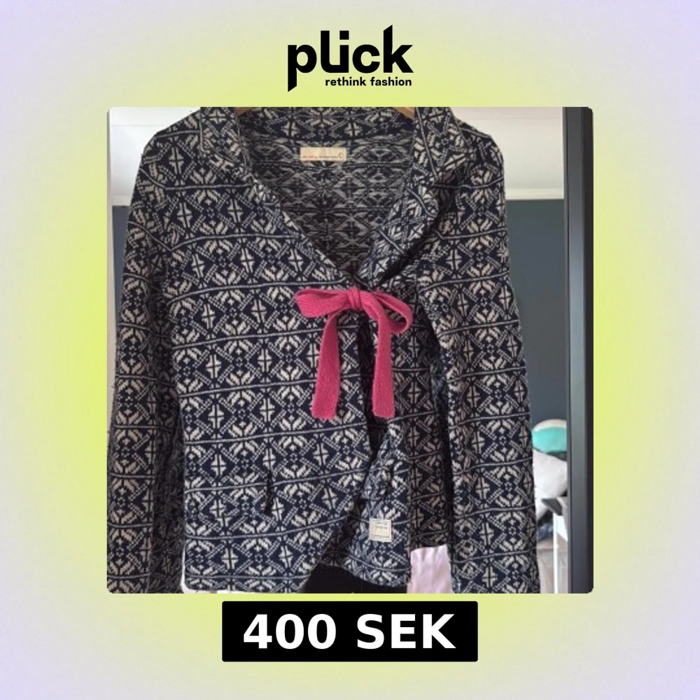 Säljer en blåvit mönstrad kofta från Odd Molly med lång ärm och en rosa rosett framtill. Koftan har ett klassiskt stickat mönster och små fickor framtill. Perfekt för dig som gillar unika detaljer!🩷🩷