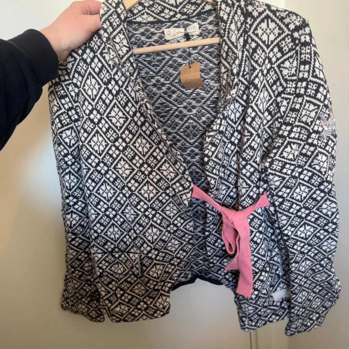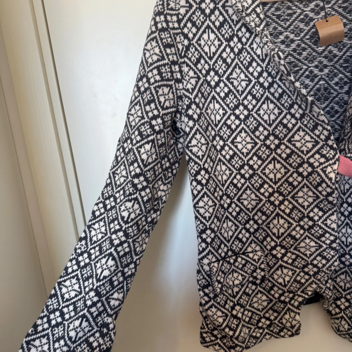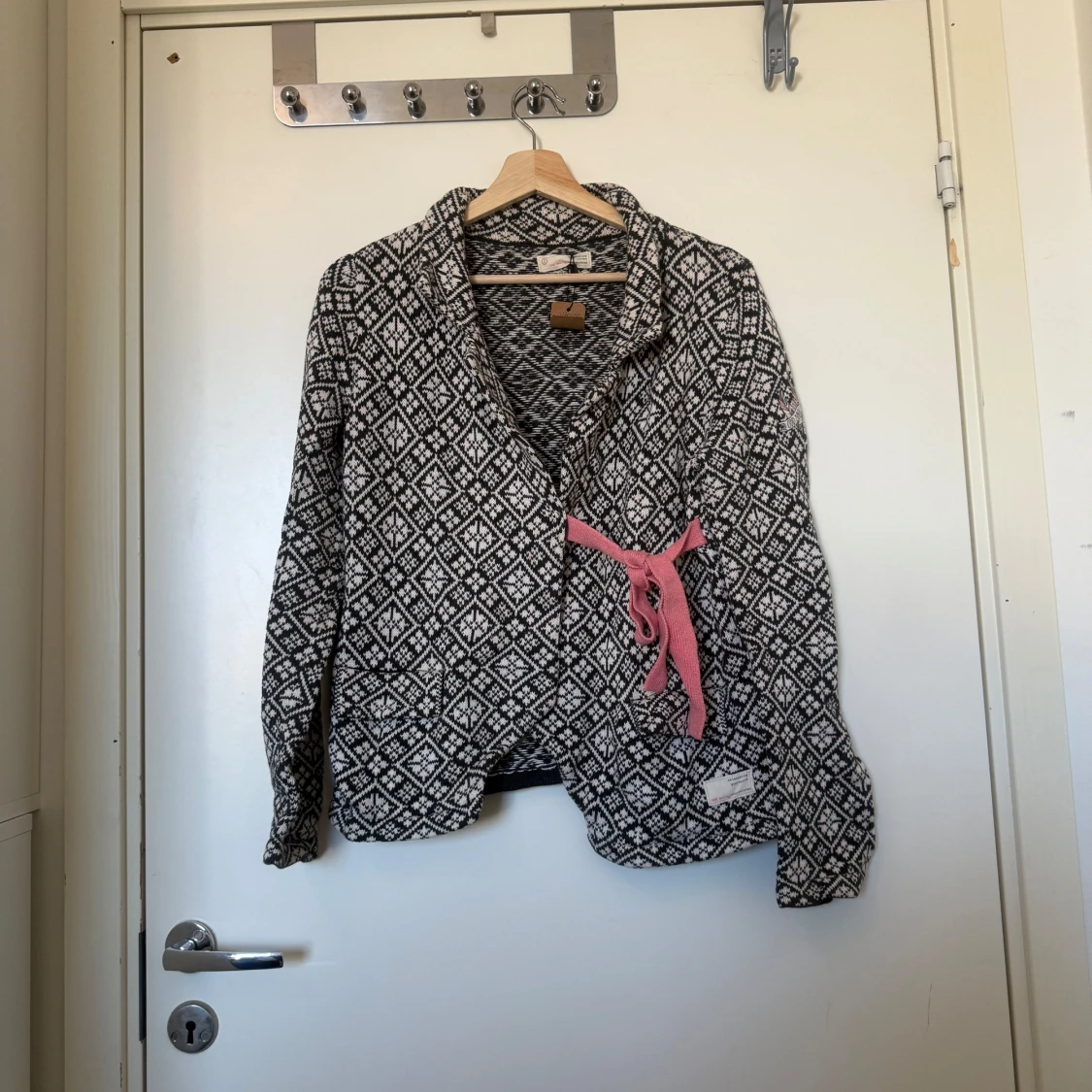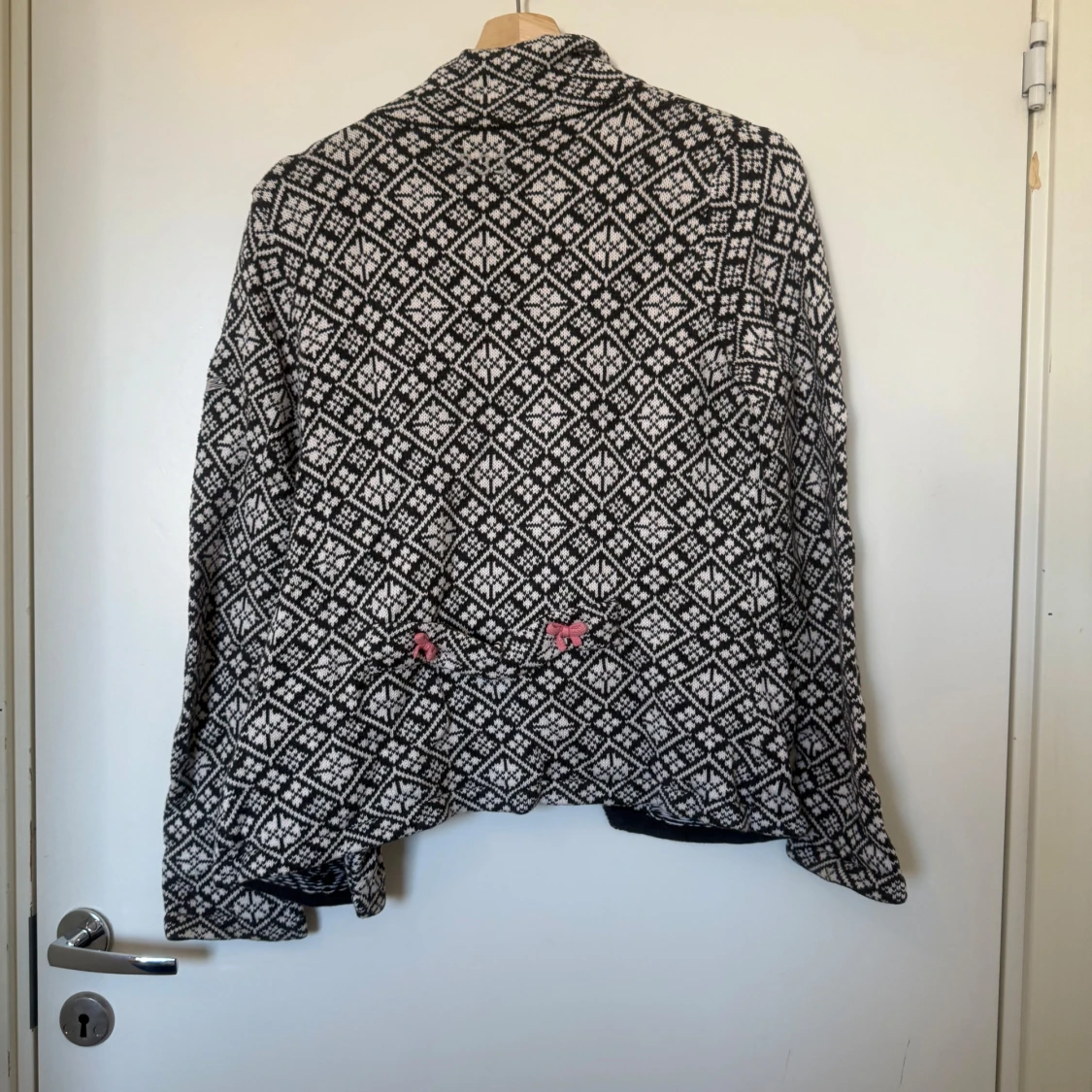 Svartvit kofta från Odd Molly med snyggt geometriskt mönster och rosa knytband i midjan. Långärmad och mjuk, perfekt för lager på lager. Koftan har två små fickor fram och broderade rosa detaljer bak. Skön och unik stil för dig som gillar statement-plagg. Storlek 2 som enligt deras storleksguide motsvarar en storlek M. Fint skick, men det finns små tecken på användning. Se bild 5.
