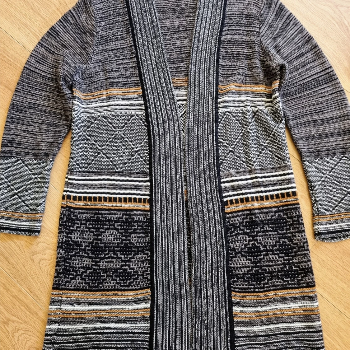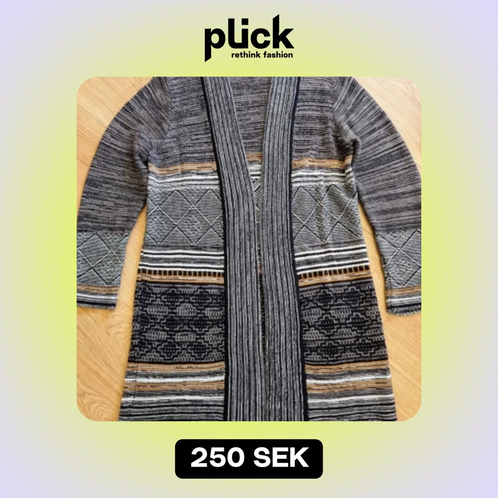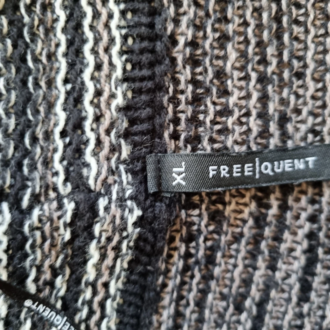 Säljer en superfin lång kofta från Freequent i storlek . Den är stickad och har ett coolt mönster i svart, grått och beige. Perfekt för höst och vinter med sina långa ärmar och mysiga känsla. Koftan har en öppen design utan knappar, vilket gör den lä