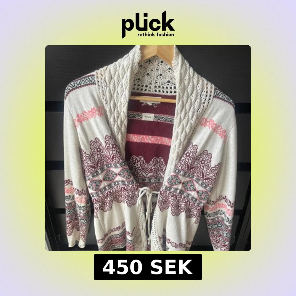 Superfin kofta i beige med vinröda, svarta och rosa mönster. Koftan har virkade detaljer vid kragen, knytband i midjan och långa ärmar. Perfekt för lager-på-lager och ger en mysig boho-vibe till din outfit.