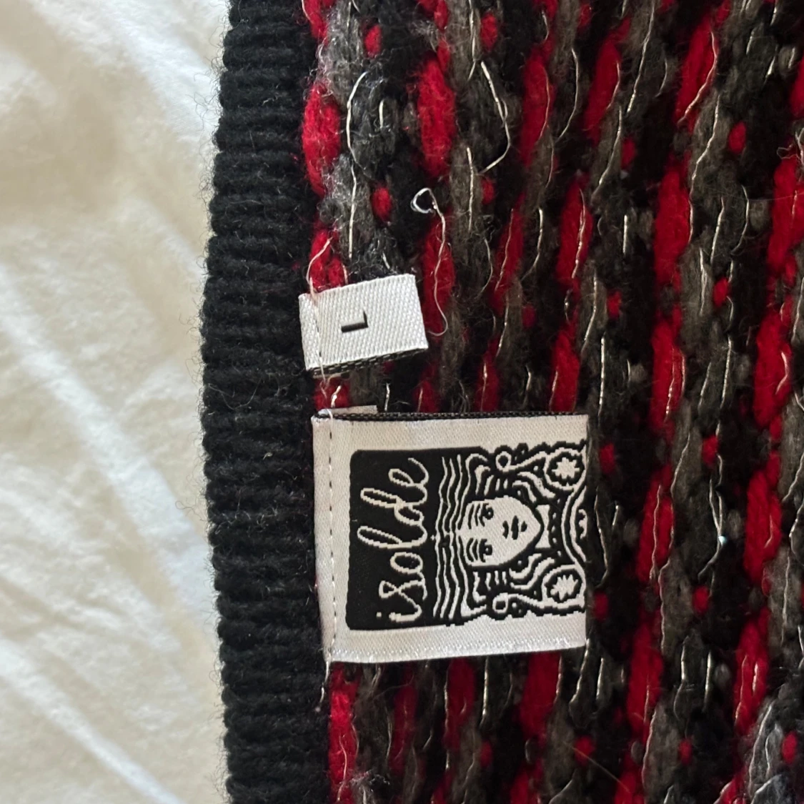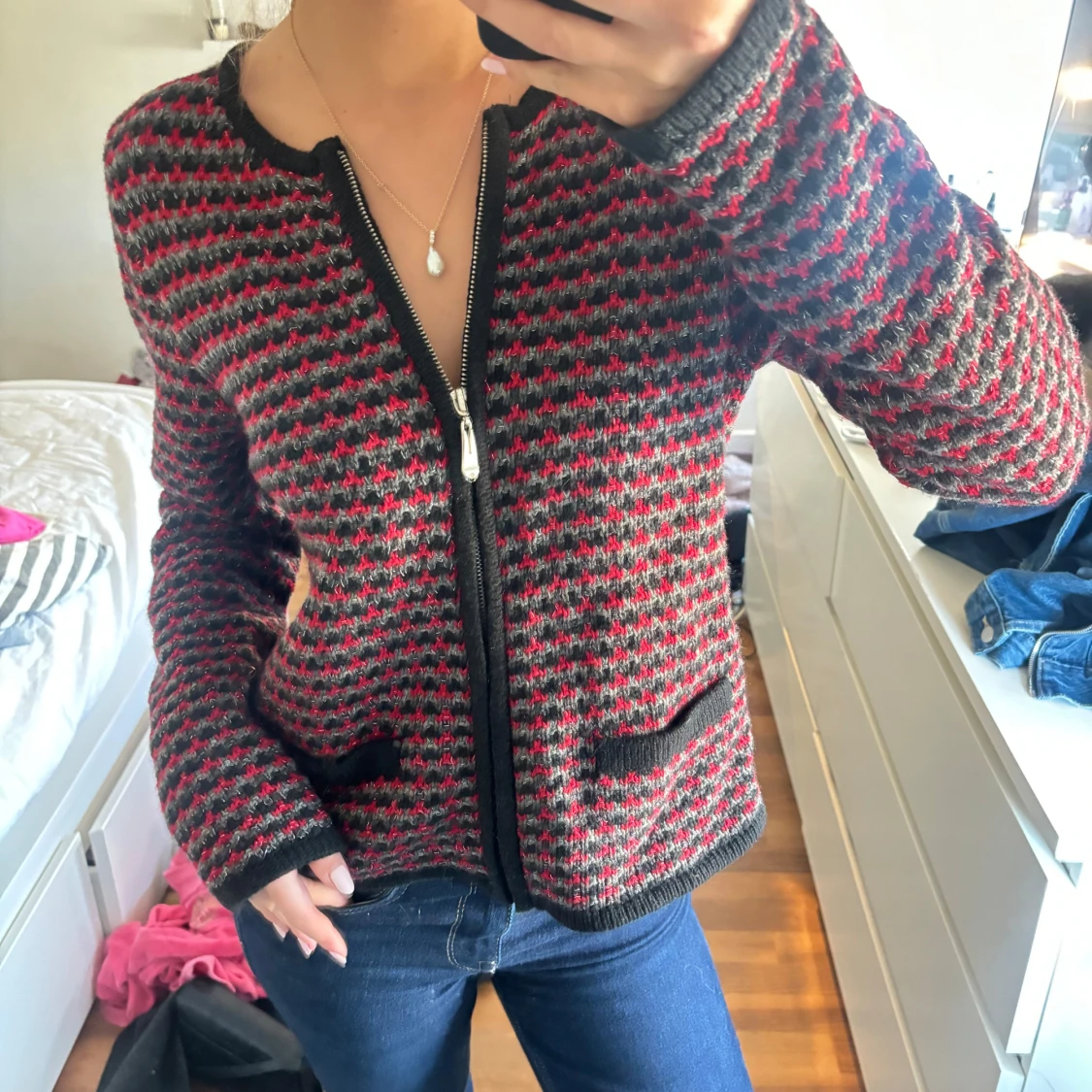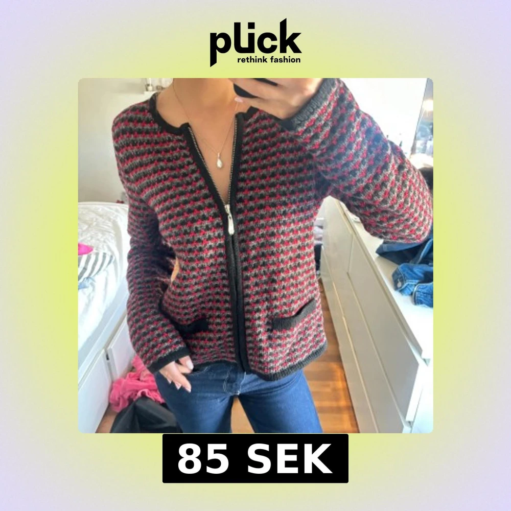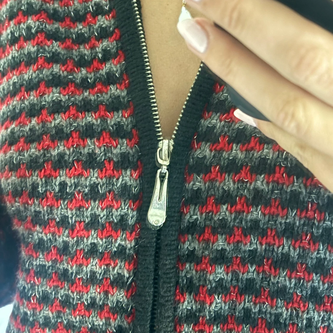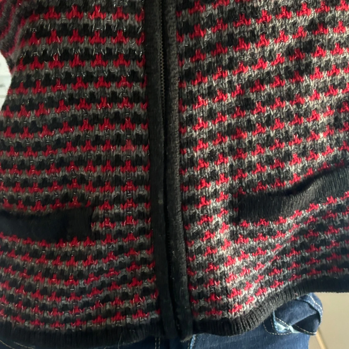 Säljer en stickad jacka från Isolde i svart, grått och rött med dragkedja framtill och två fickor. Jackan har lång ärm och ett diskret mönster som ger en cool retrovibe. Perfekt för dig som gillar unika plagg med lite edge.