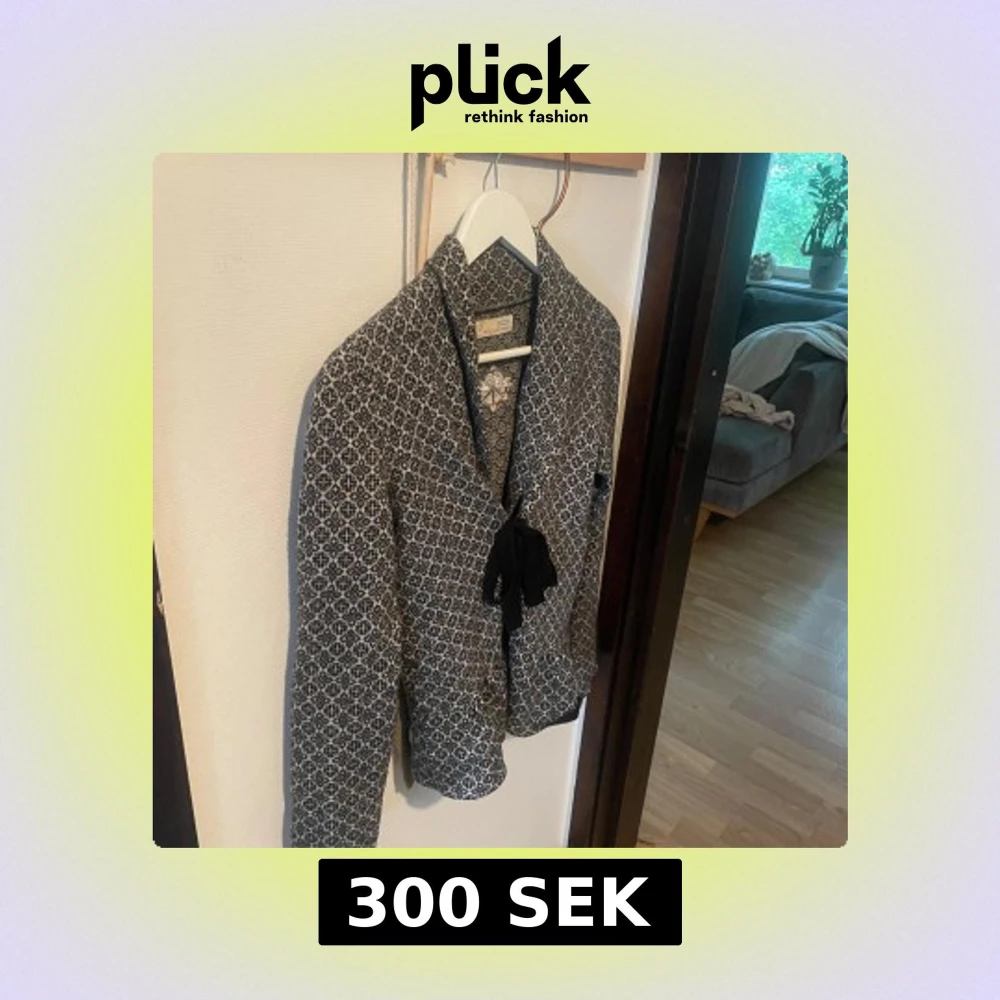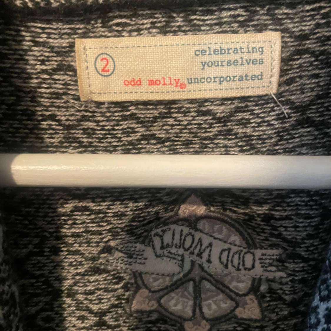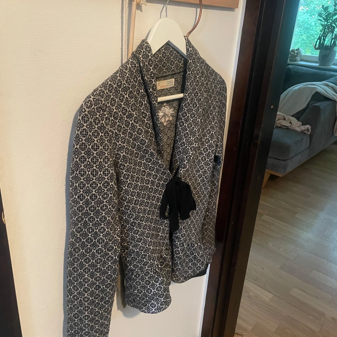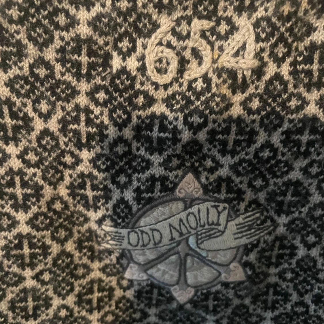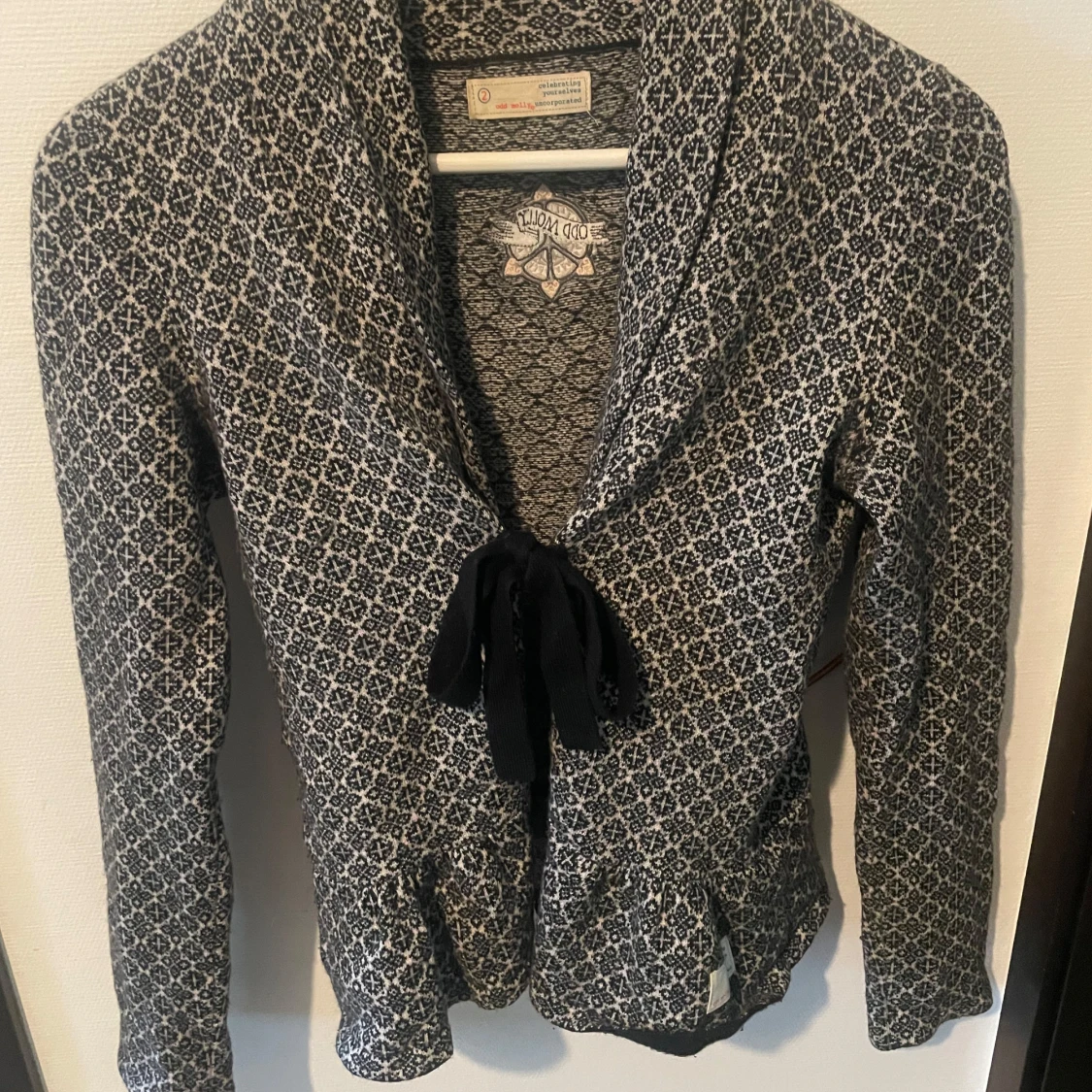 Jag har storlek xs/s och den passar mig.Snygg stickad jacka från Odd Molly i svart och grått med rutig känsla och broderad detalj. Jackan har lång ärm, knytband framtill och ett unikt mönster över hela plagget. Perfekt för dig som vill ha något både bekvämt och stilrent.