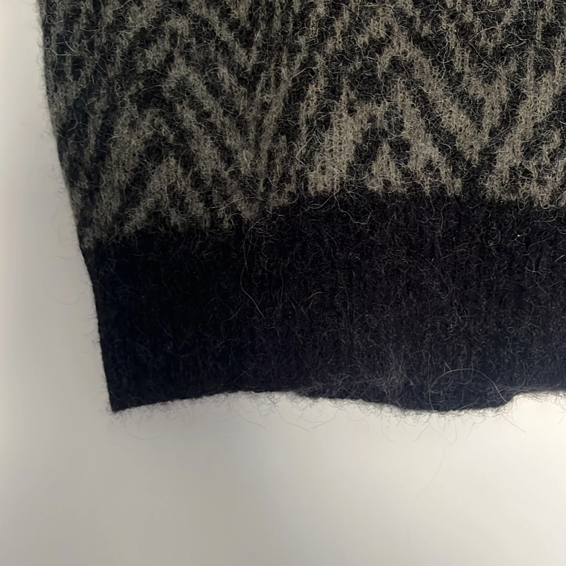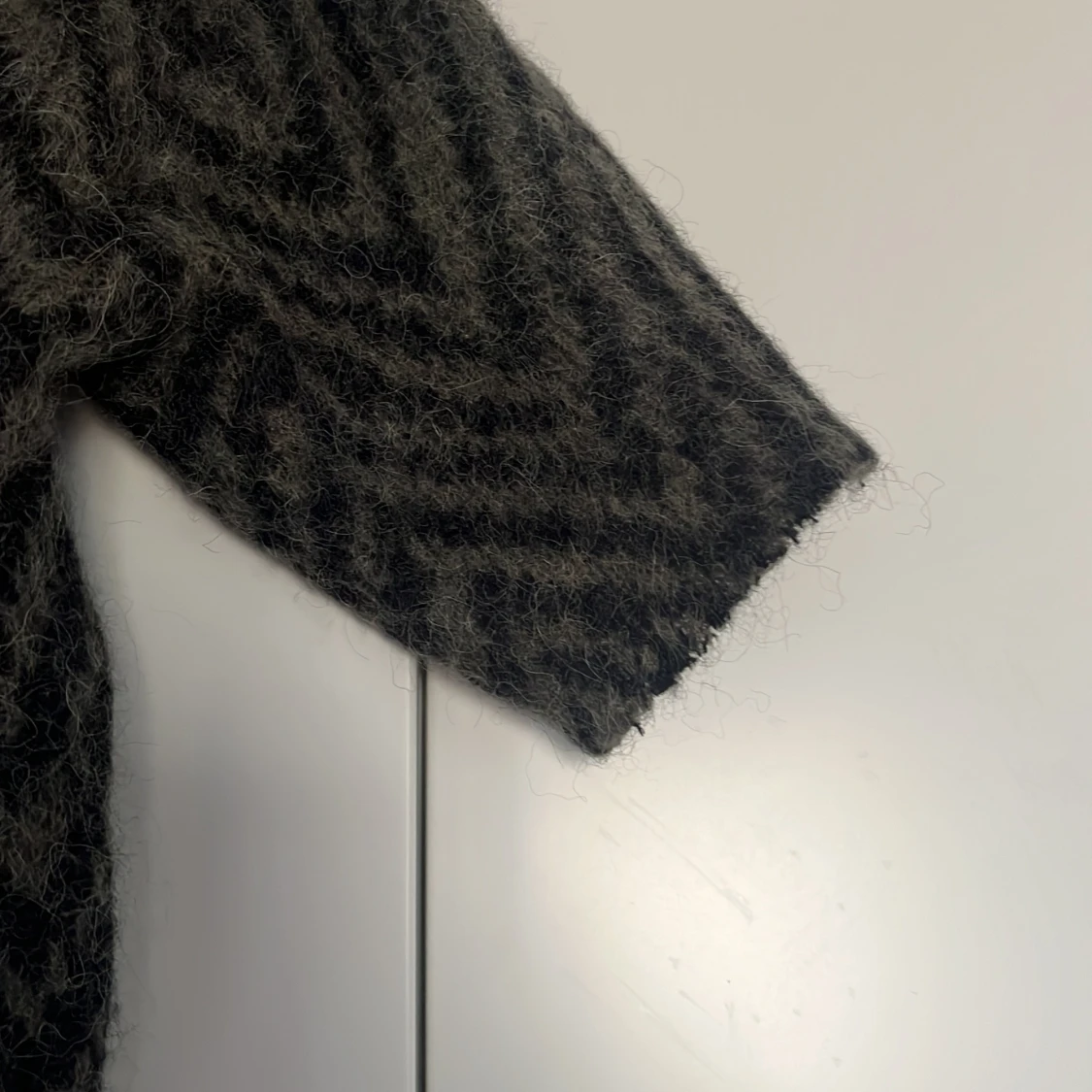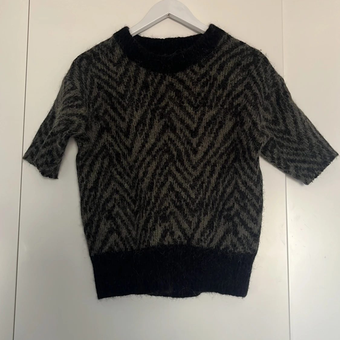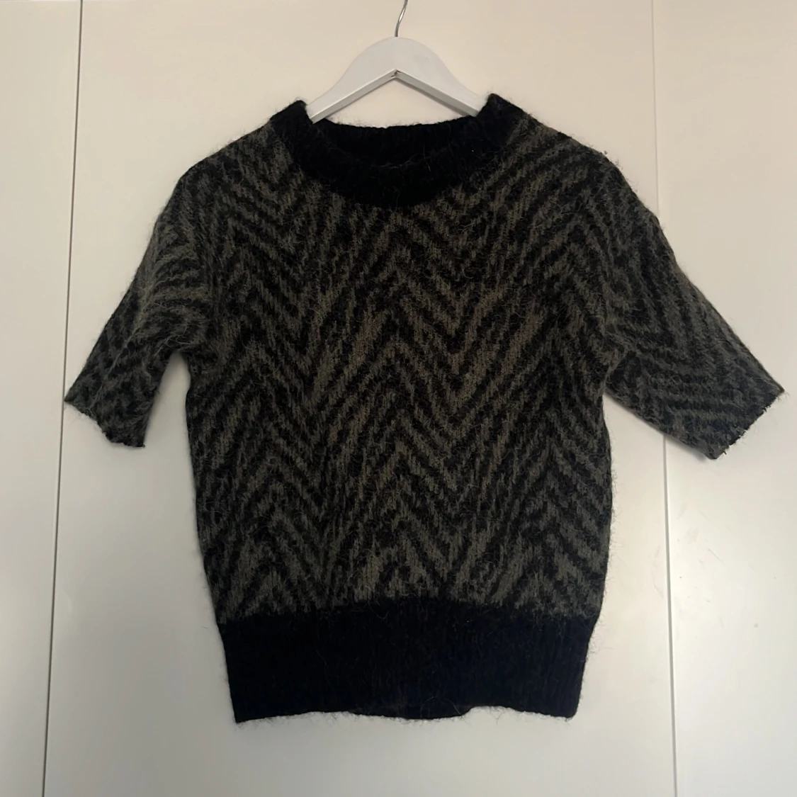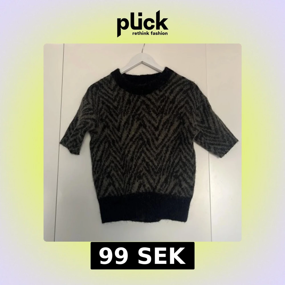 Säljer en stickad tröja med ett zebra liknande mönster i svart och grön. Tröjan har korta ärmar och en rund halsringning. Perfekt för kyligare dagar!