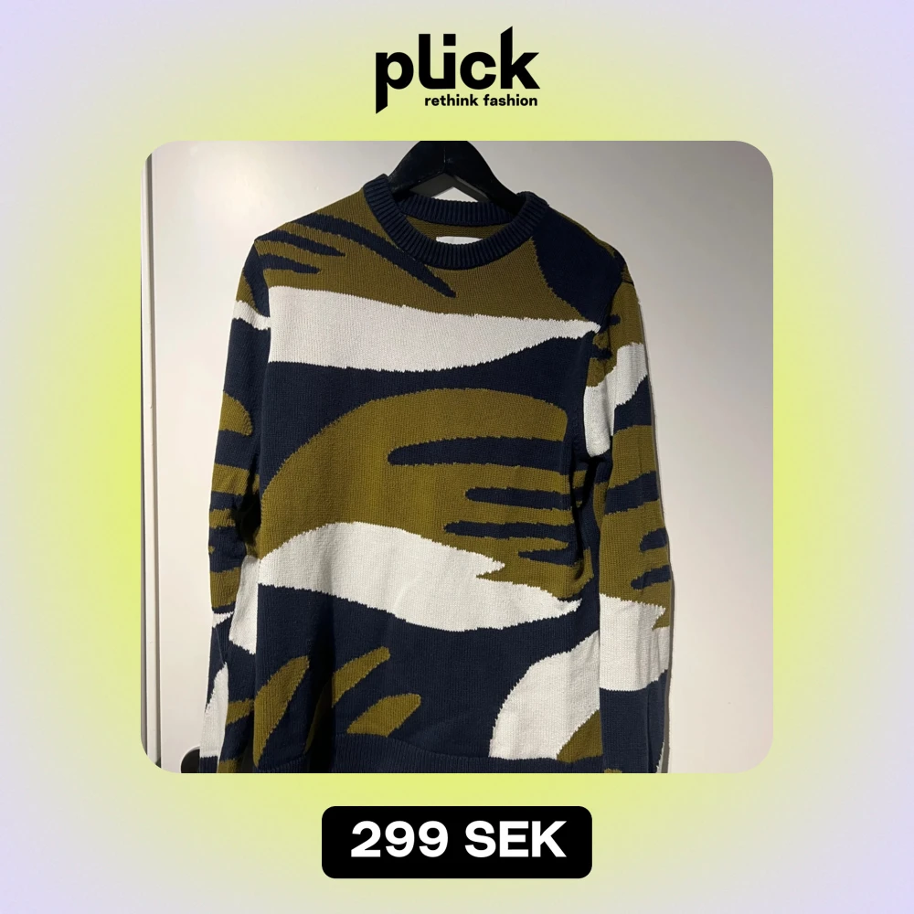 Säljer en cool stickad tröja med ett unikt mönster i olivgrön, marinblå och vit. Perfekt för att sticka ut i mängden! Tröjan har långa ärmar och en bekväm passform. Perfekt för höst och vinter.