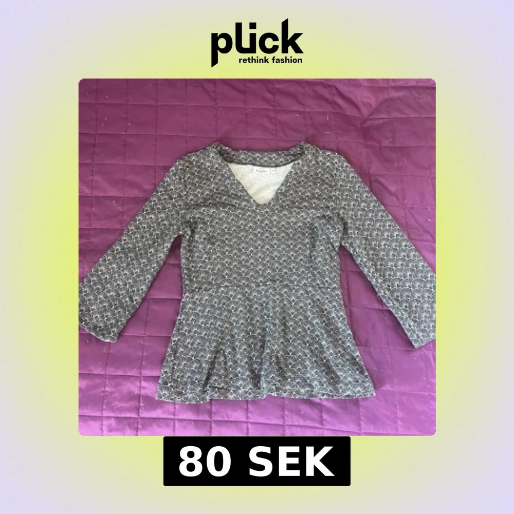 Säljer en snygg mönstrad topp med trekvartsärm och v-ringning. Toppen har ett svart och vitt geometriskt mönster och en lätt utsvängd nederdel. Perfekt för en stilren look!🙌🤩