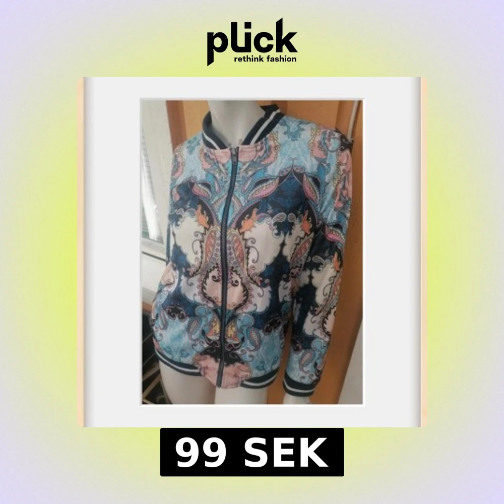 Jätte fin Zip tröja från ONLY med ett unikt mönster i blått, rosa och svart. har dragkedja framtill och ribbade muddar vid ärmslut och nederkant. 2 fickor. Stort nummer 52 på ryggen ger en sportig touch.
