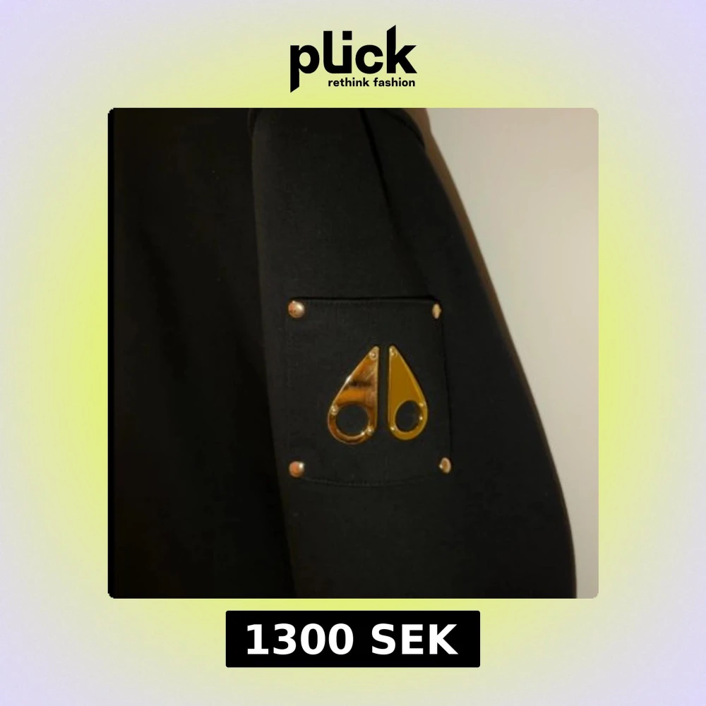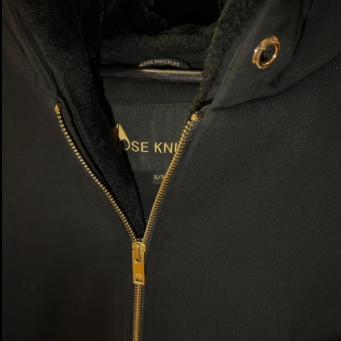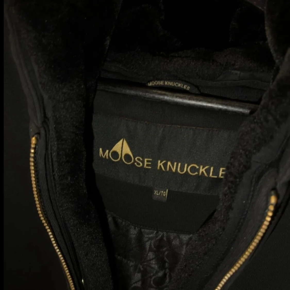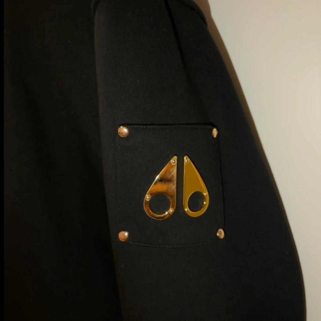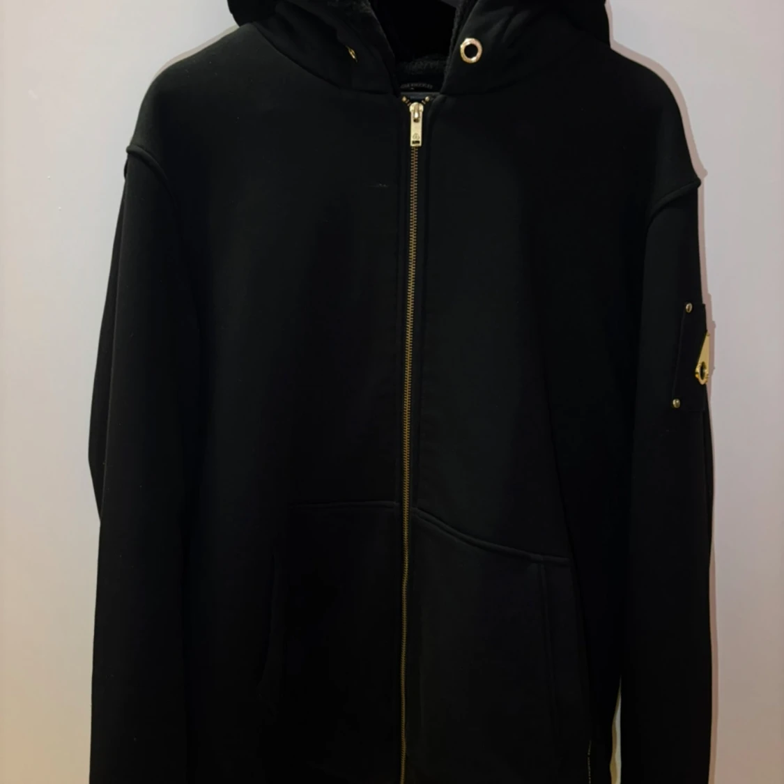 Svart hoodie från Moose Knuckles i storlek XL med guldfärgade detaljer och dragkedja. Tröjan har huva, fickor framtill och ett snyggt guldemblem på ärmen. Insidan är fodrad med mjukt material för extra komfort och värme.