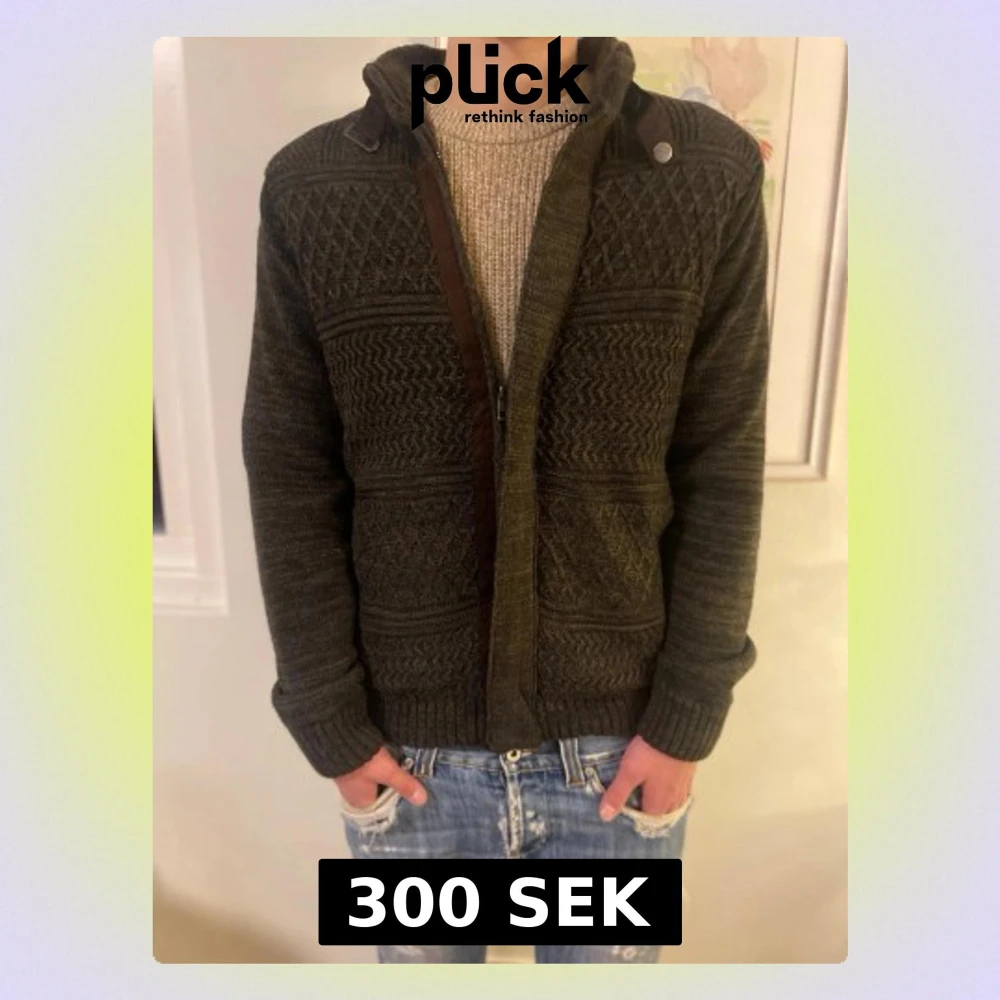 Säljer en mörkbrun stickad kofta med quiltat foder. Koftan har dragkedja, ribbade muddar och snygga mönster i stickningen. Perfekt för kyliga dagar och har hög krage med knappdetalj. Storlek är M men är lite stor i storleken, Killen på bilder är 182 och väger 70kg.